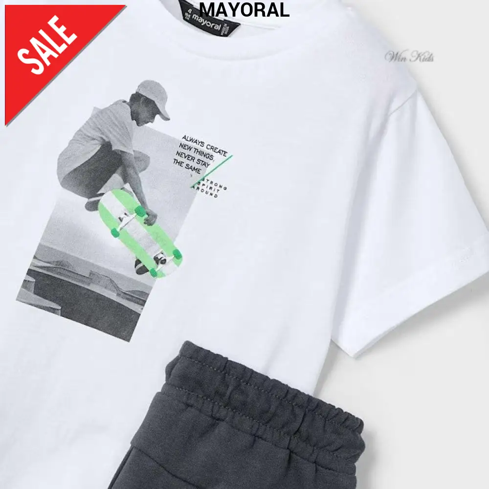 Completo MAYORAL in cotone composto da t-shirt con stampa e bermuda con elastico in vita e laccetto regolabile.