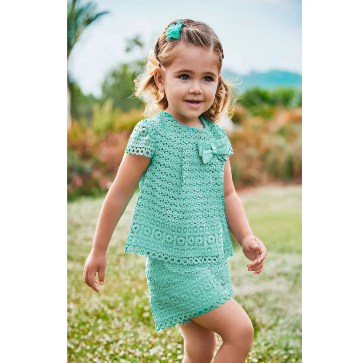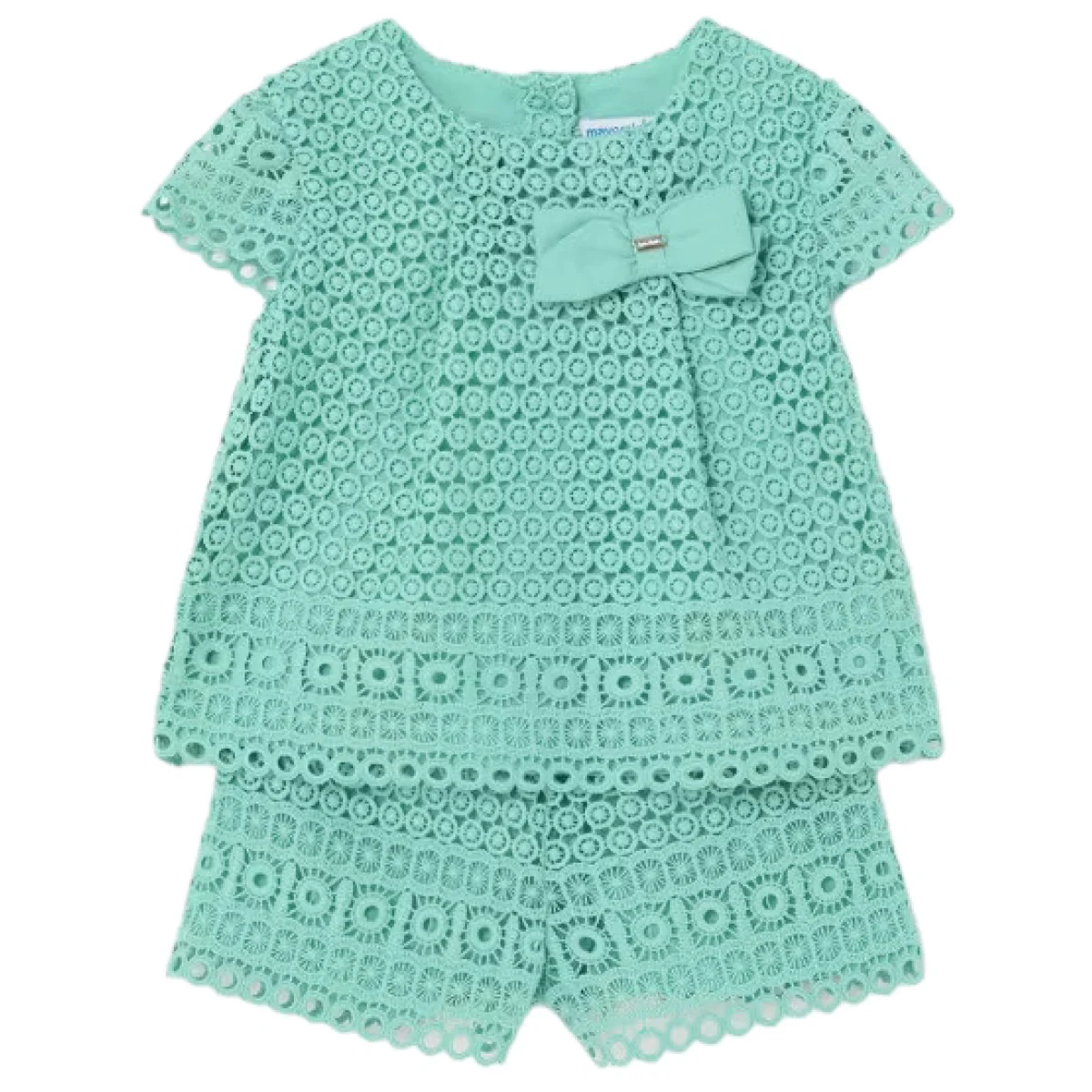 Completo MAYORAL lavorato all’ uncinetto, composto da camicina con fiocco applicato con logo in metallo, fodera in cotone, chiusura con bottoncini sul retro; shorts con elastico in vita e fodera interna in cotone.