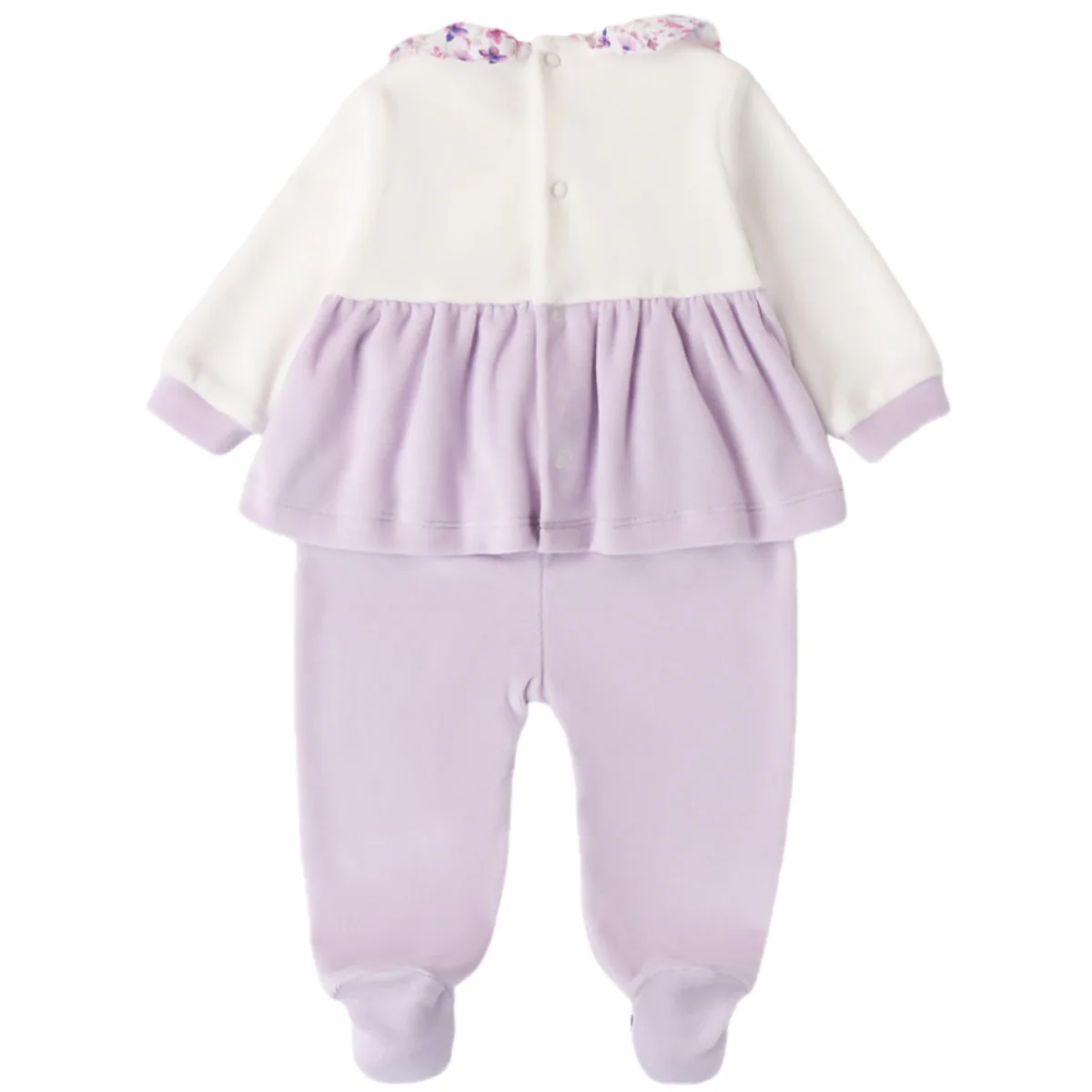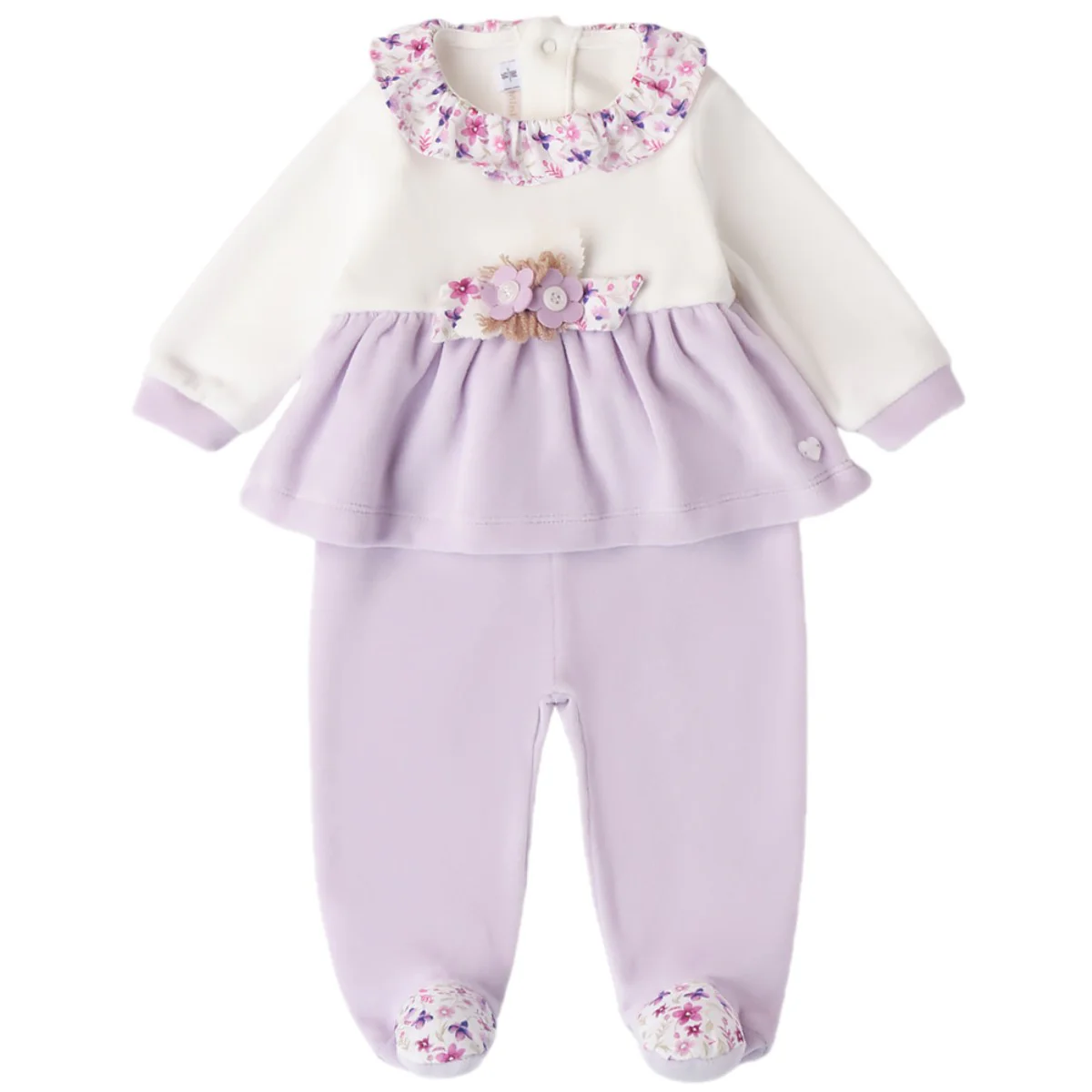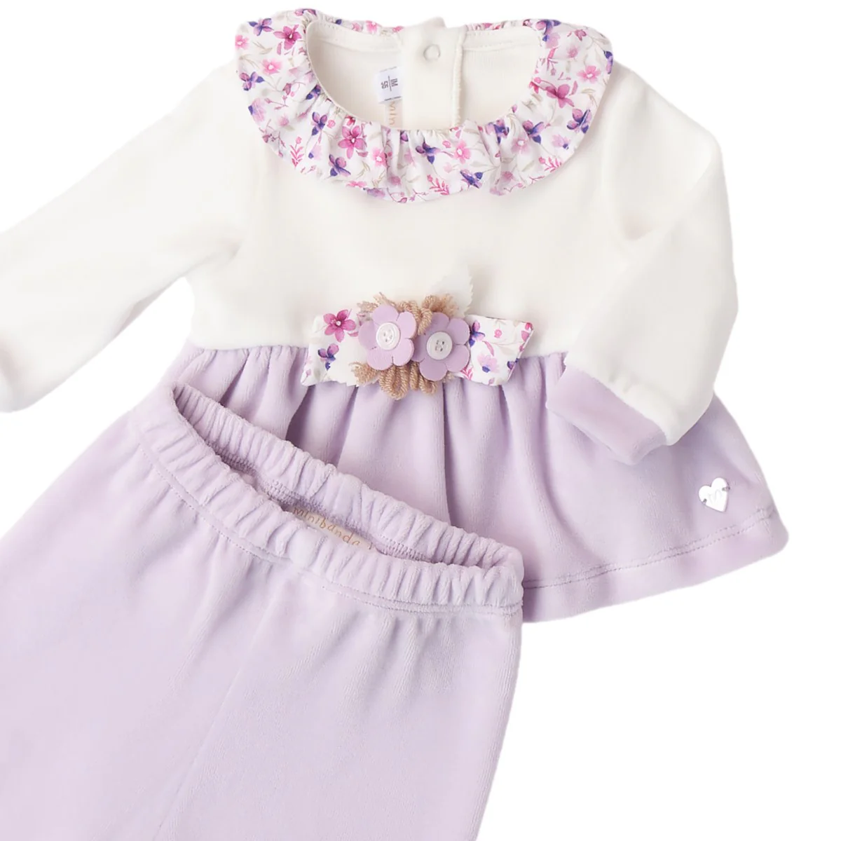 Completo MINIBANDA in ciniglia composto da: maglietta con colletto applicato a fantasia, fiocco, fiori e bottoncini applicati in vita, chiusura con clips sul retro, logo applicato a rilievo; ghettina con elastico in vita con inserti a fantasia sui piedini.