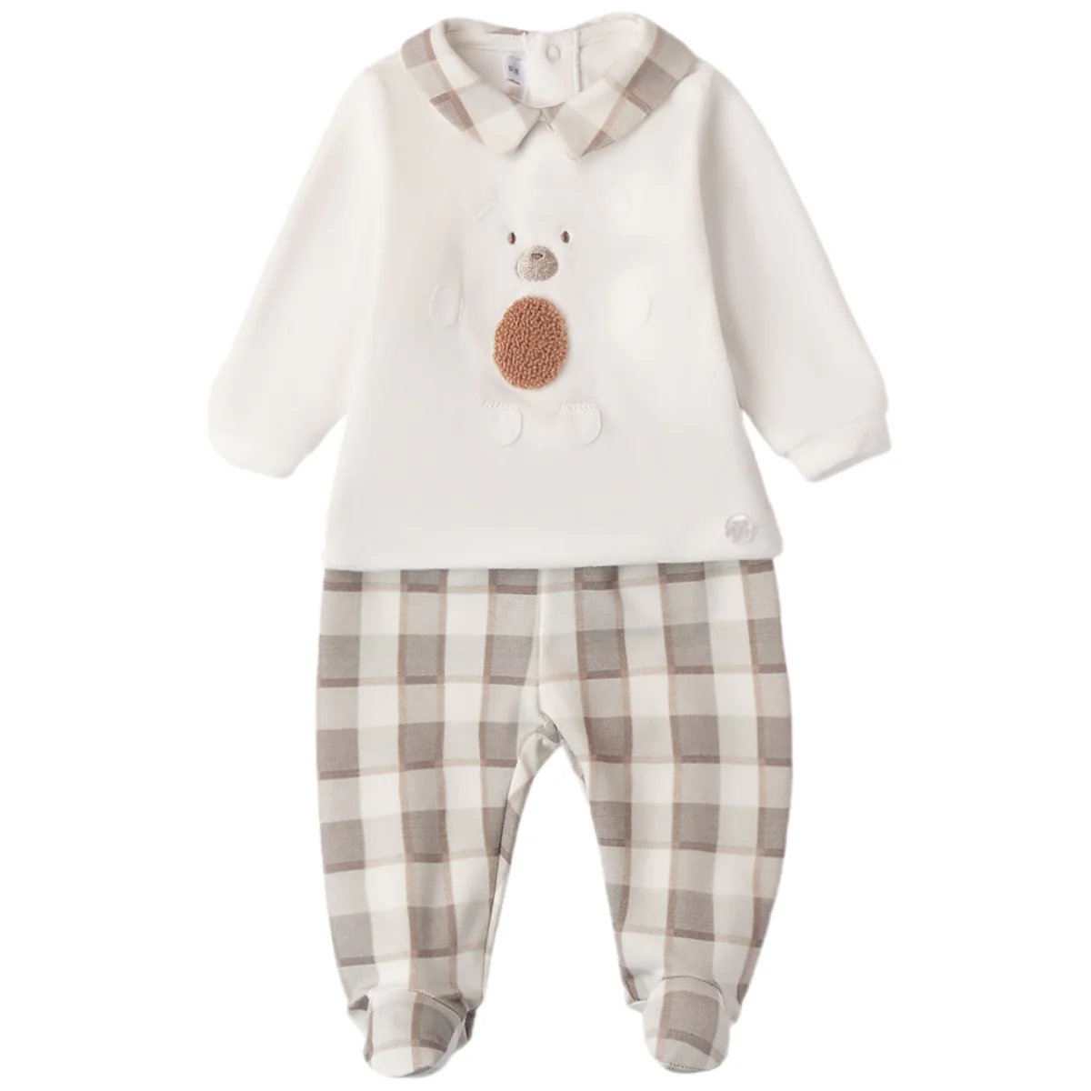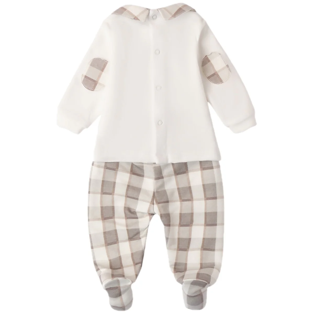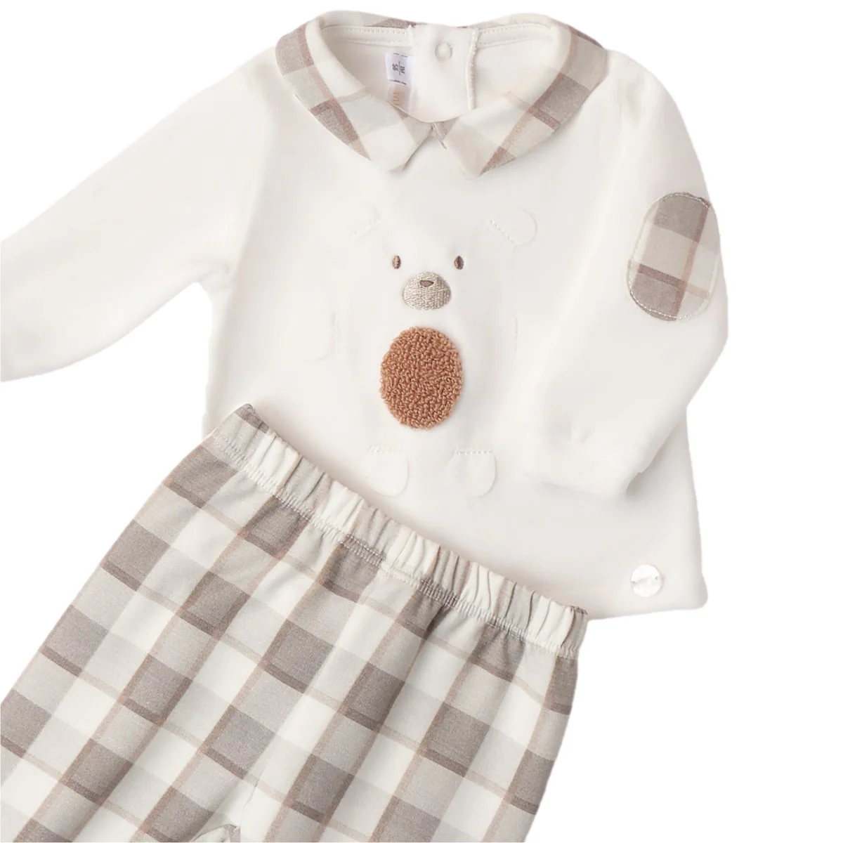 Completo MINIBANDA composto da: felpa in ciniglia con colletto applicato a fantasia quadri a contrasto, patch e ricami applicati, logo applicato a rilievo, toppe ai gomiti applicate a fantasia quadri, chiusura con clips sul retro; ghettina in felpa a fantasia quadri con elastico in vita.