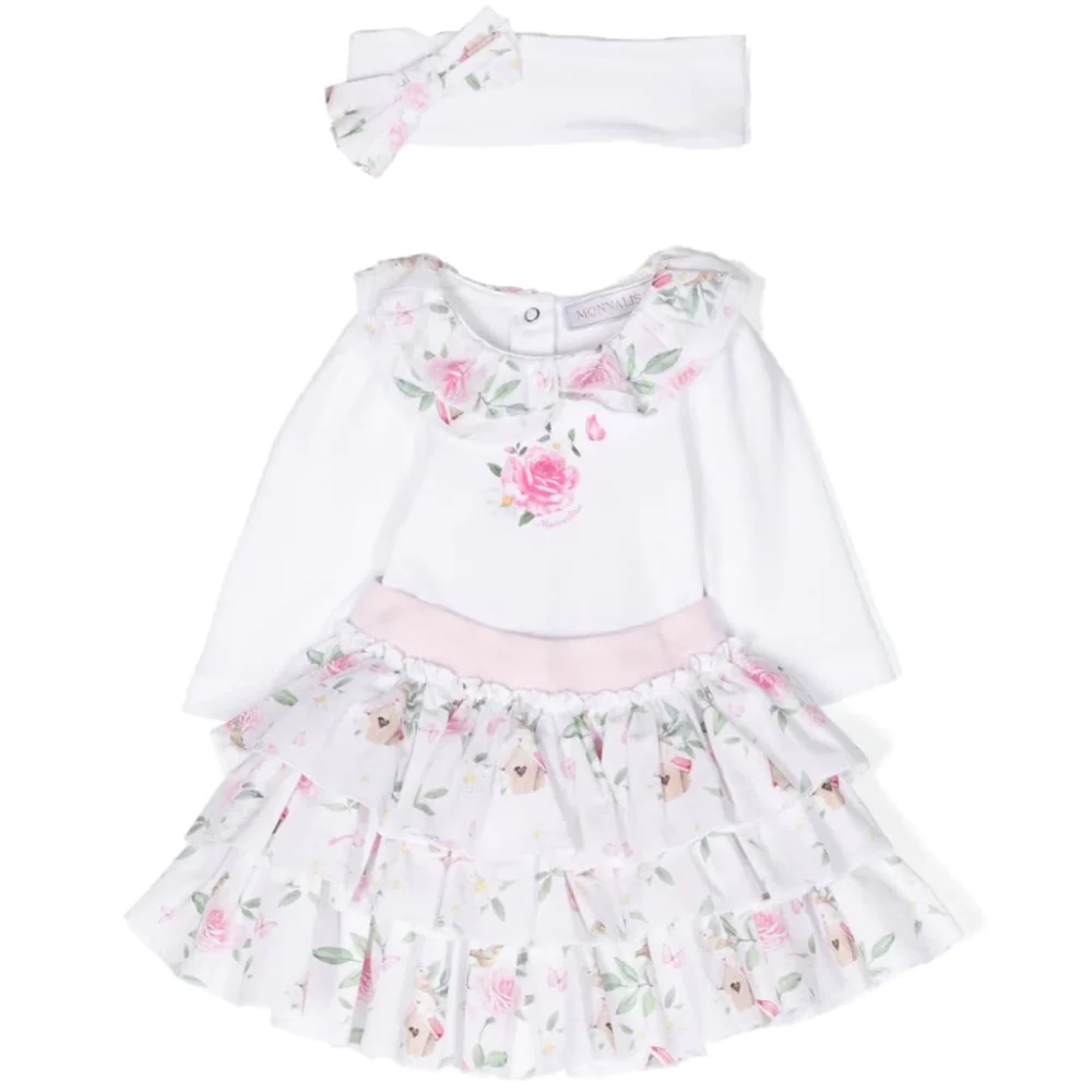 Completo MONNALISA composto da body in cotone con colletto applicato a fantasia a contrasto logo stampato applicato chiusura con clips sul retro. Gonna multi balze a fantasia logata con elastico in vita. Fascia in cotone con fiocco applicato a fantasia a contrasto.
