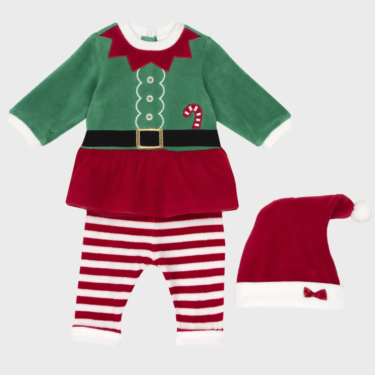 Completo Natale CHICCO in ciniglia modello elfo composto da mini abito con ricami e patch applicati in colori a contrasto, inserto in tulle applicato, chiusura con clips sul retro, pantalone a fantasia rigata con elastico in vita, cappello con pom pon e fiocchetto applicato, fodera interna in cotone.