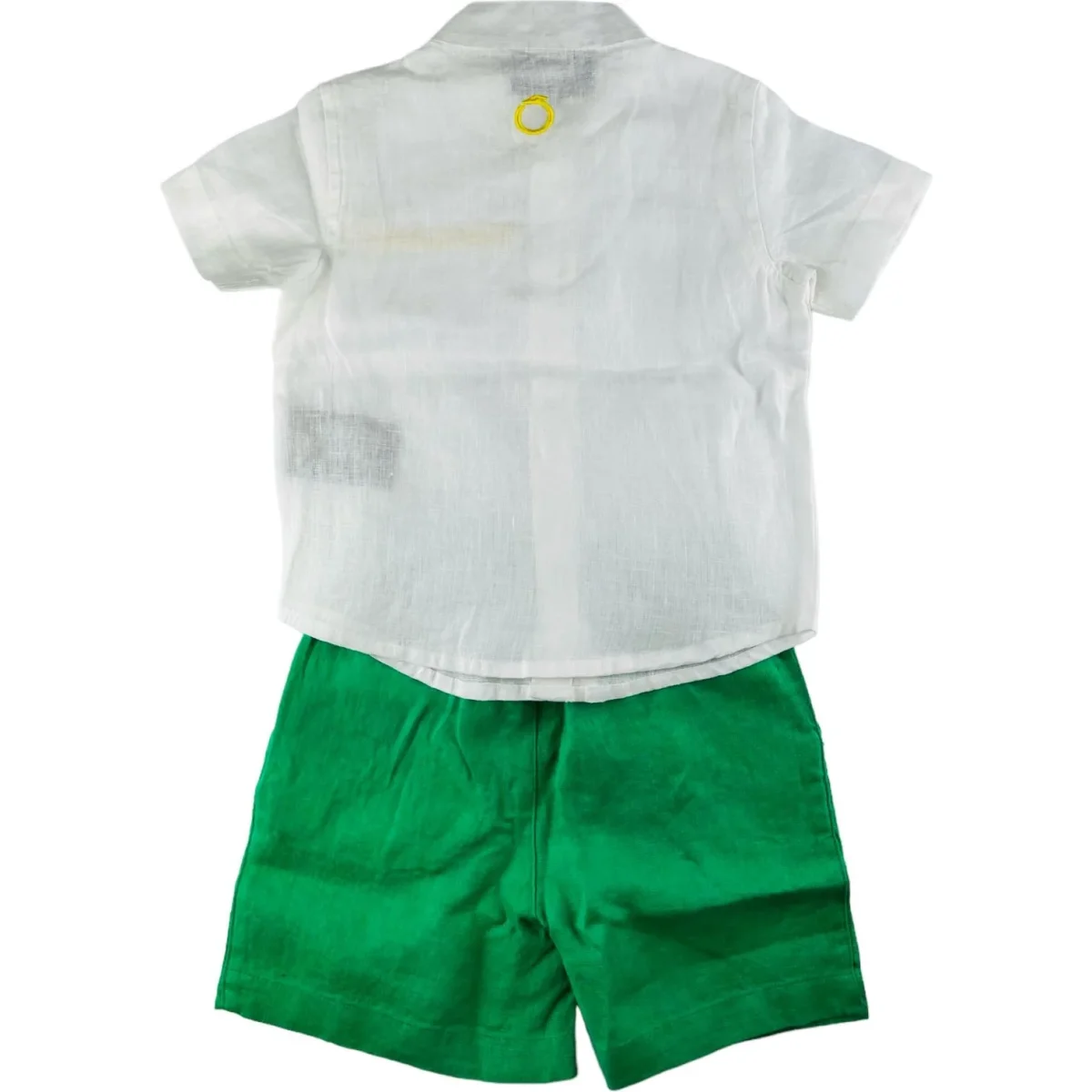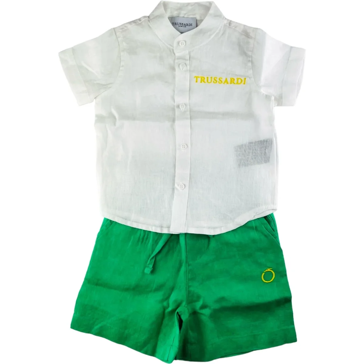 Completo TRUSSARDI composto da camicia in lino con colletto a pistagna logo ricamato, bermuda coordinato in lino con ricamo.