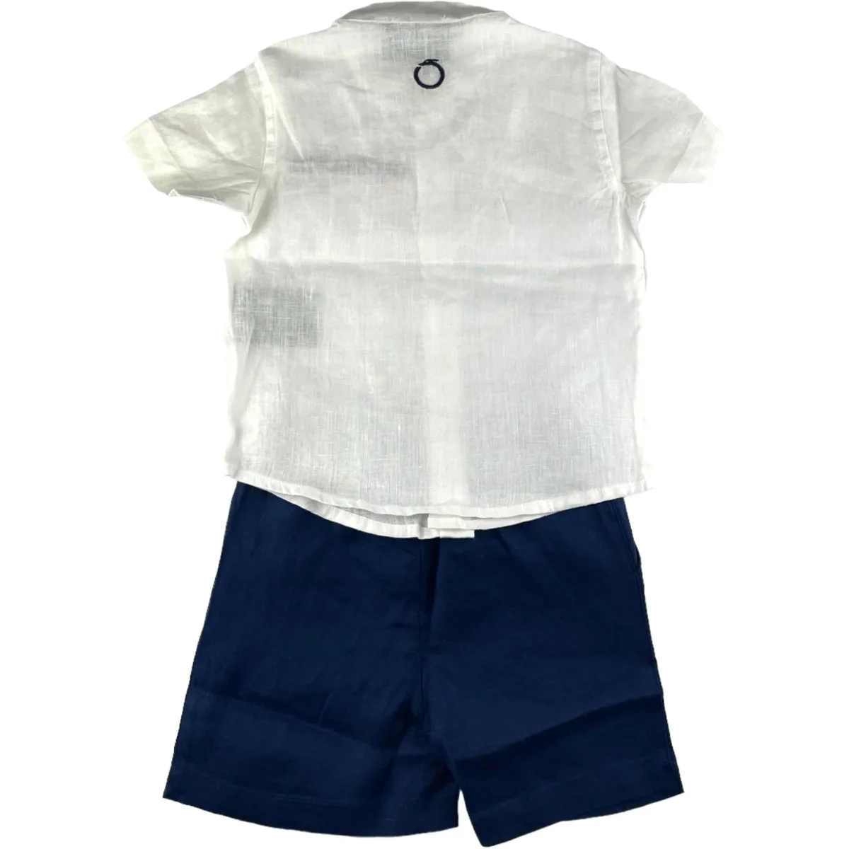 Completo TRUSSARDI composto da camicia in lino con colletto a pistagna logo blu ricamato, bermuda coordinato in lino con ricamo.