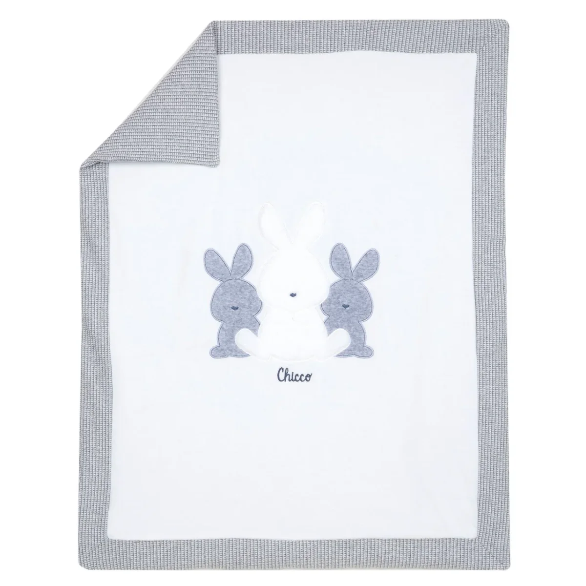 Coperta CHICCO per neonato in ciniglia , grafica con applicazioni e ricami , retro in interlock tinto filo . Dimensione cm 80×64 .