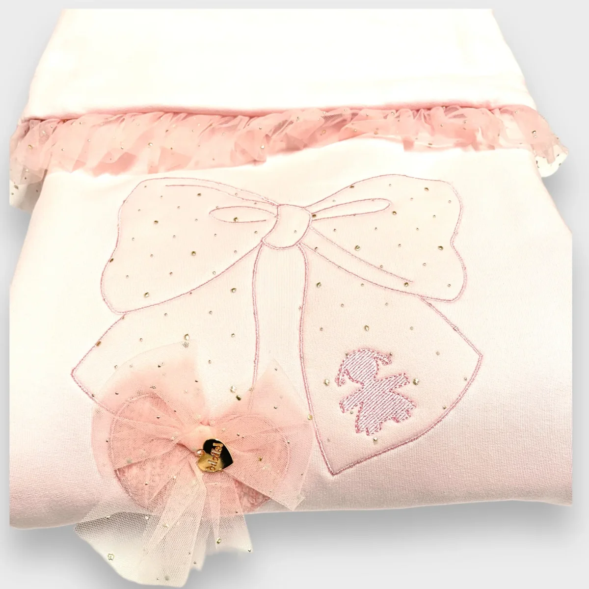 Coperta LE BEBE’ in felpa con fiocco ricamato ed applicazioni in tulle. modello da carrozzina.