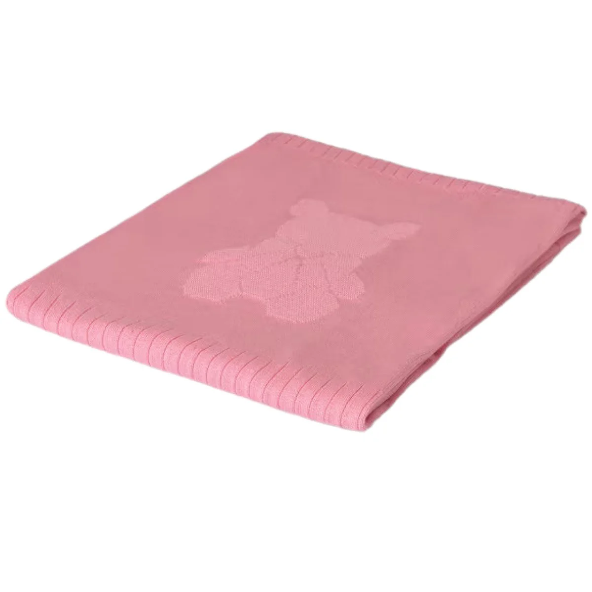 Coperta MAYORAL in filo con lavorazioni a costine ai lati e ricamo orsetto centrale, modello da carrozzina.