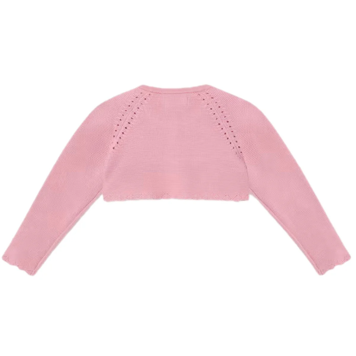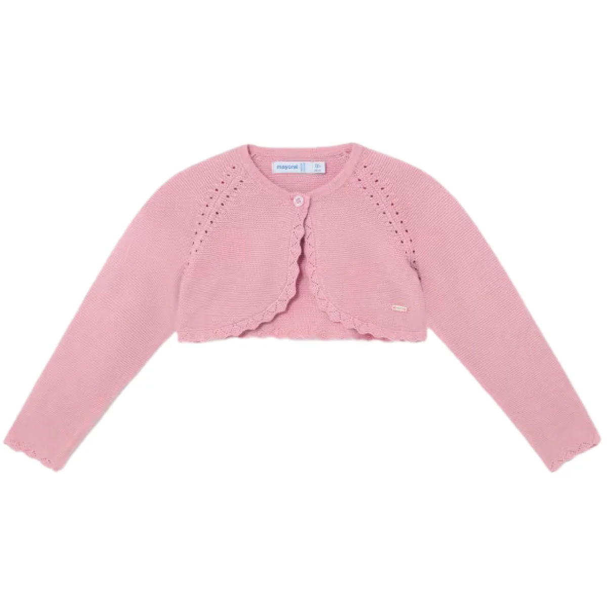 Coprispalle MAYORAL con trafori e ricami applicati, chiusura con bottoncino, logo in metallo applicato.