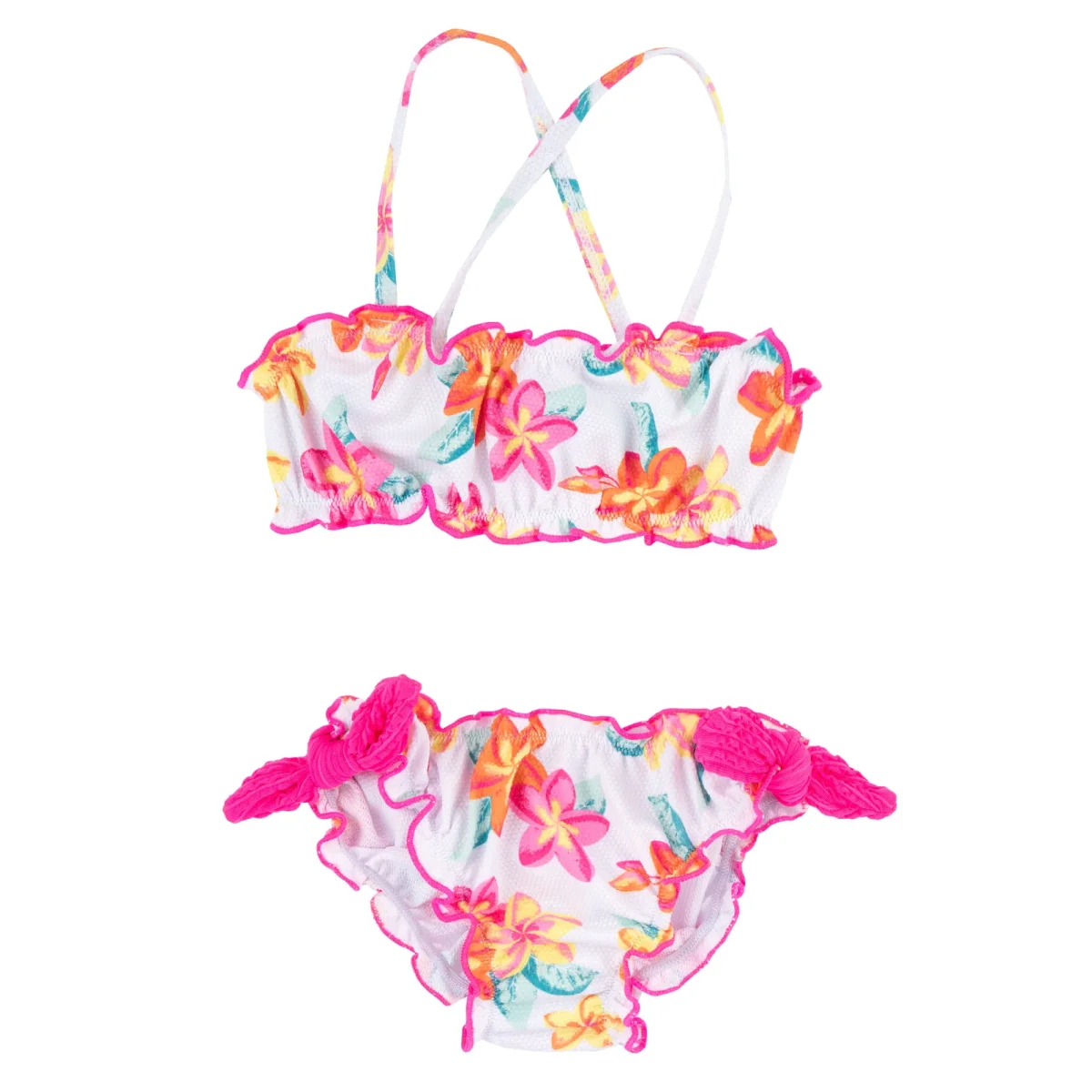 Costume CHICCO modello due pezzi a fantasia floreale in colori a contrasto, finti nodi applicati ai fianchi.