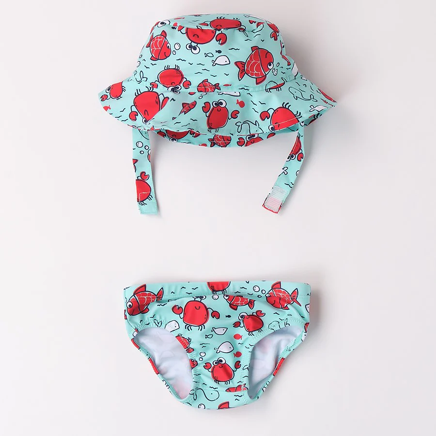 Costume I DO modello a slip fantasia mare in colori a contrasto con elastico in vita; in coordinato cappello con la stessa fantasia e chiusura con velcro.