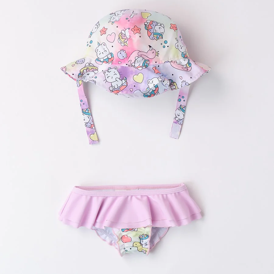 Costume I DO a fantasia unicorno in colori a contrasto con voilants, elastico in vita e al giro gamba; in coordinato cappello con la stessa fantasia con chiusura velcro.