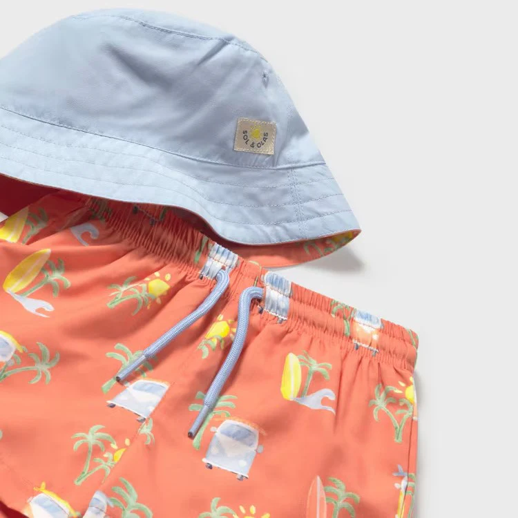 Costume e Cappello MAYORAL in tessuto a fantasia arancio con filtro protettivo UPF 40+ .
