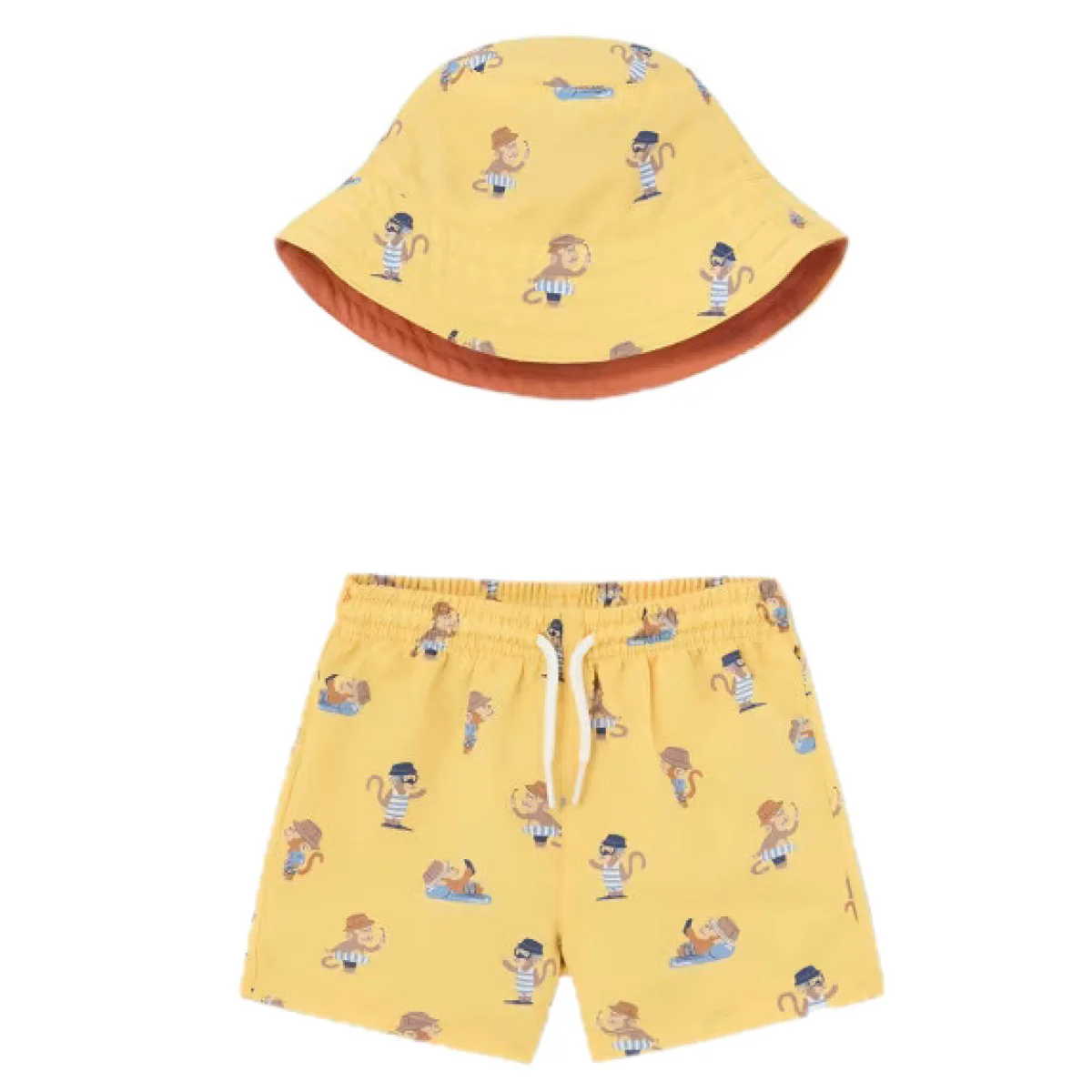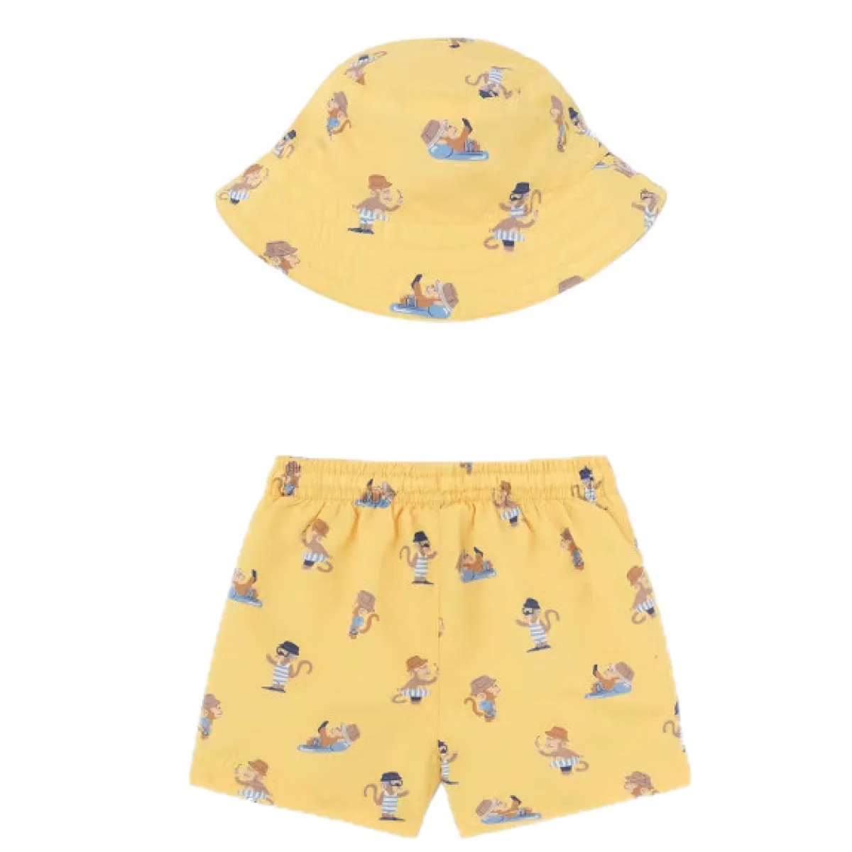 Costume MAYORAL in tessuto a fantasia in colori a contrasto con elastico e laccetto regolabile in vita, in coordinato cappello con la stessa fantasia.
