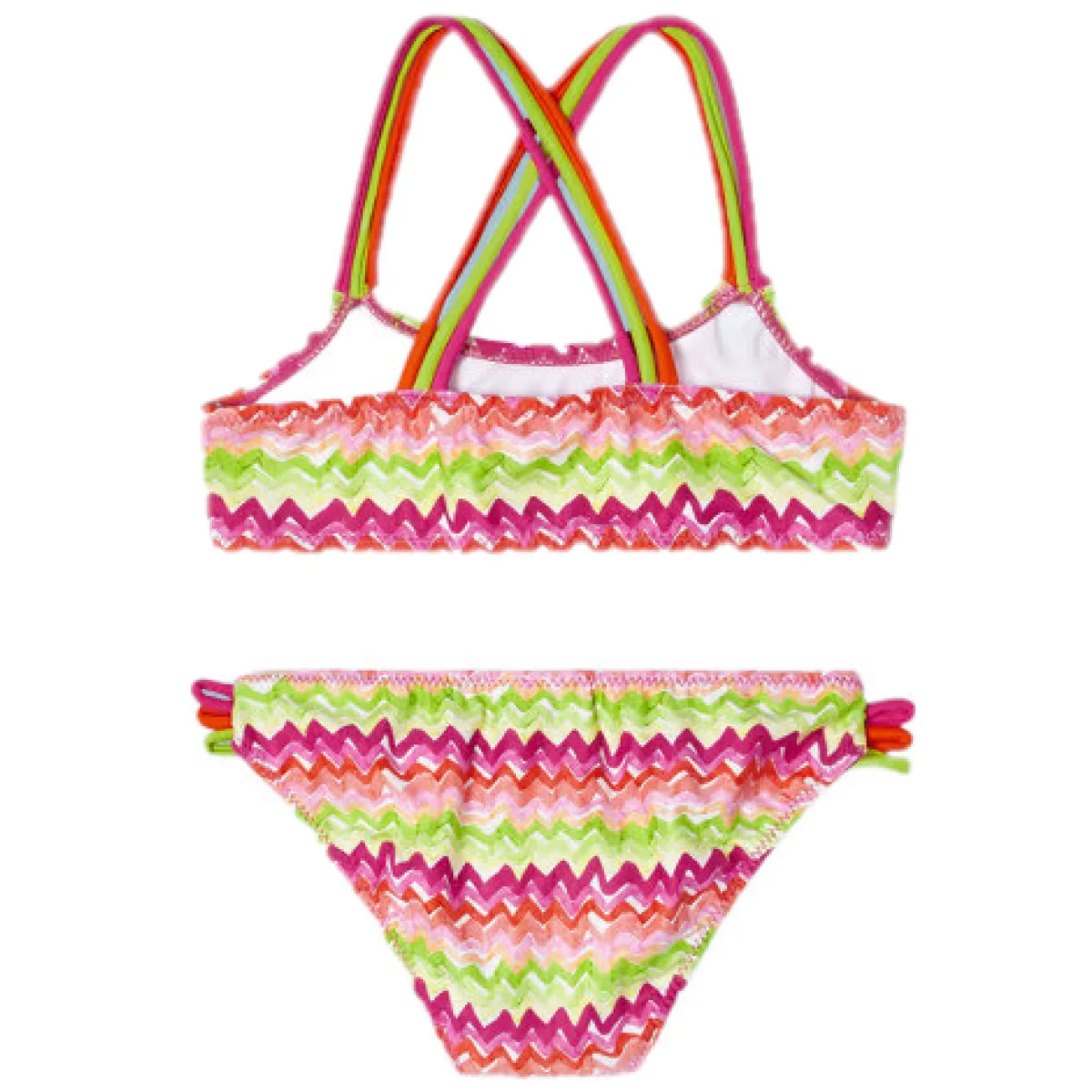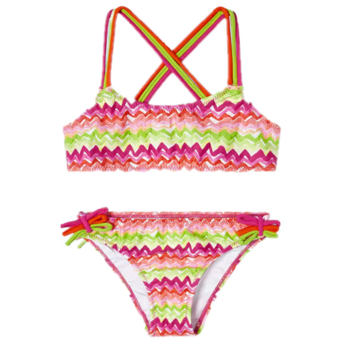 Costume MAYORAL modello due pezzi in tessuto a fantasia in colori a contrasto, finti fiocchetti applicati.