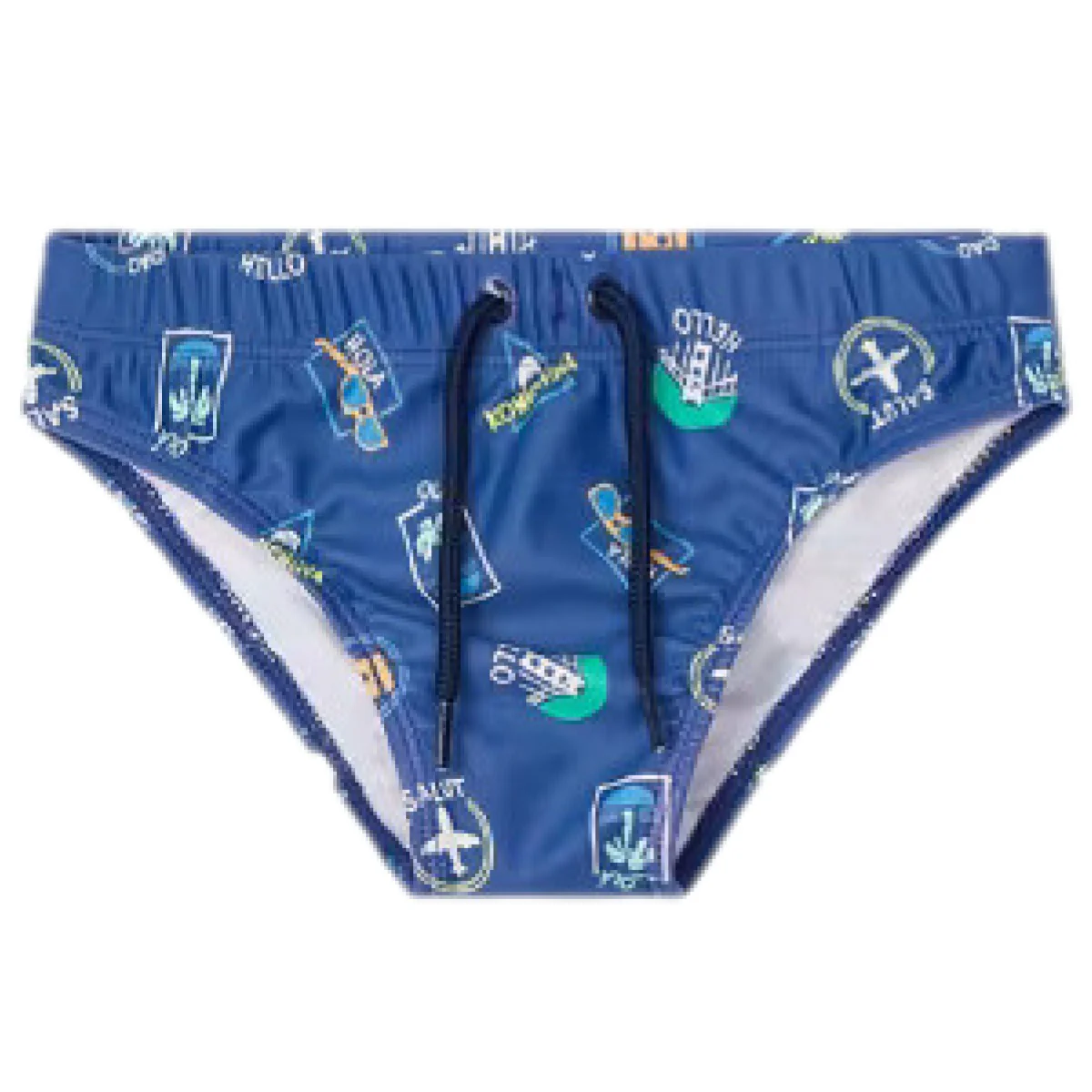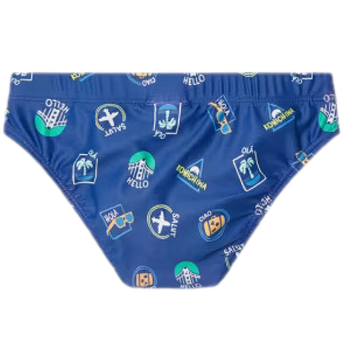 Costume MAYORAL modello slip in tessuto a fantasia in colori a contrasto, elastico e finto laccetto in vita applicato.