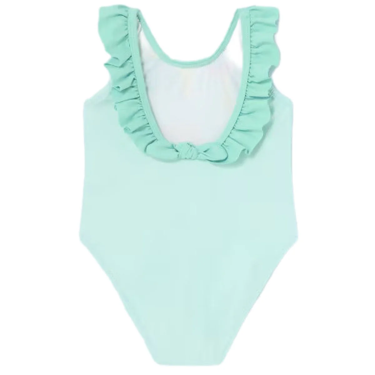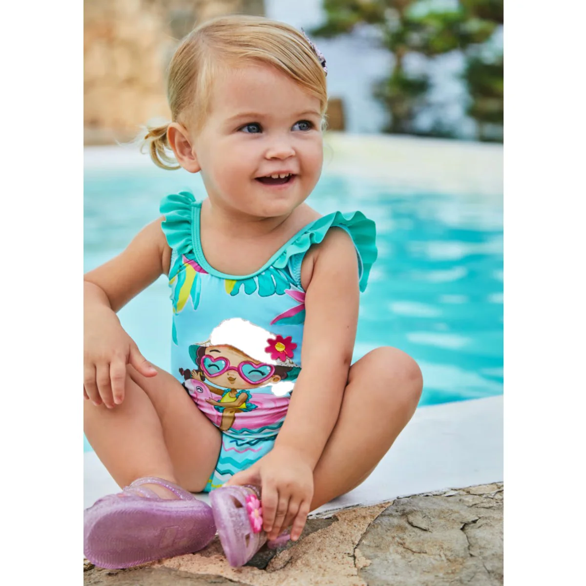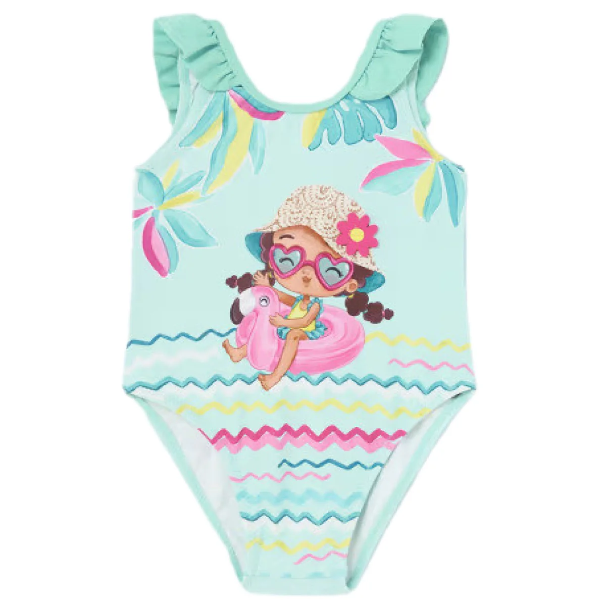 Costume MAYORAL modello intero in tessuto con stampa applicata in colori a contrasto, voilant e fiocco applicato sul retro.