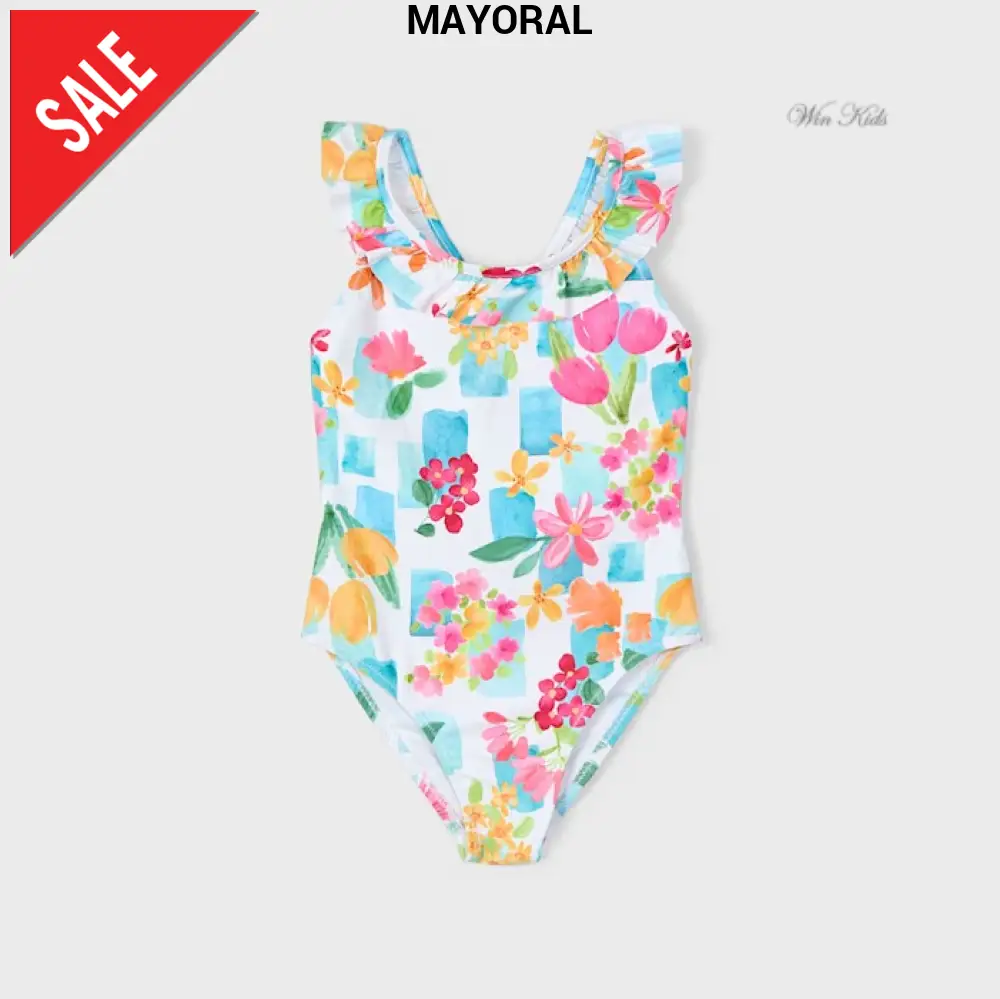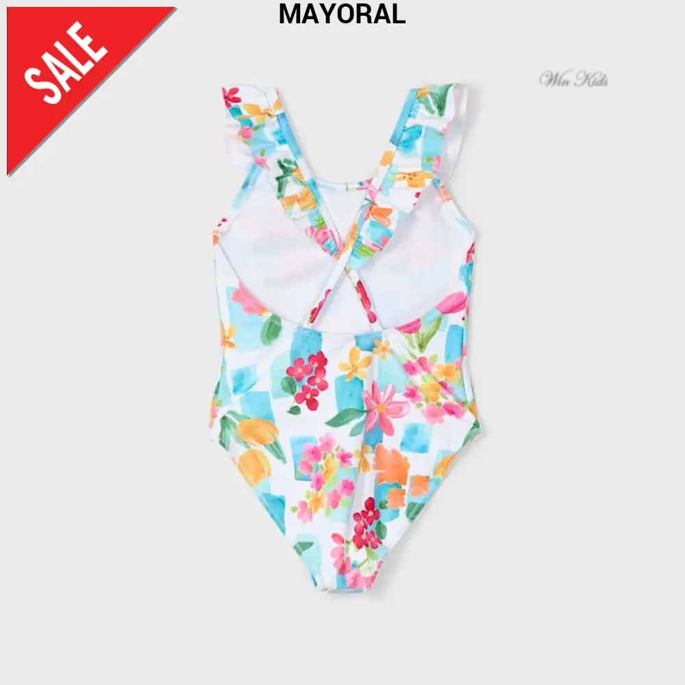 Costume MAYORAL, modello intero, in lycra a fantasia floreale multicolor, rouche applicata, bretelle incrociate sul retro.
