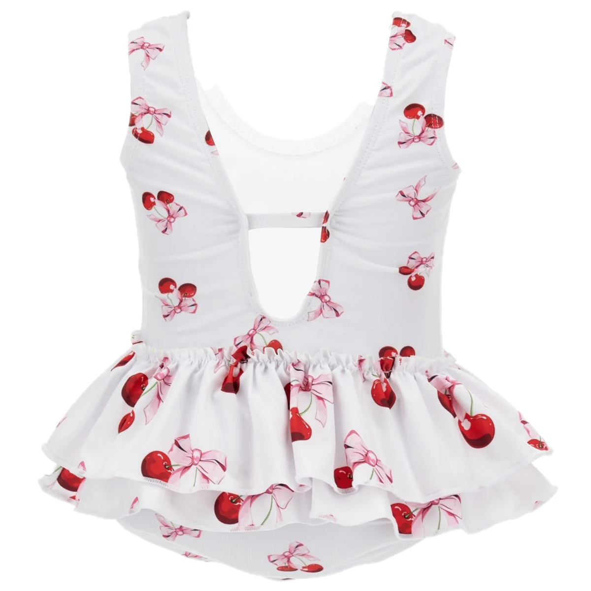 Costume MONNALISA modello intero a fantasia logata in colori a contrasto, logo stampato applicato, doppie rouches applicate in vita.
