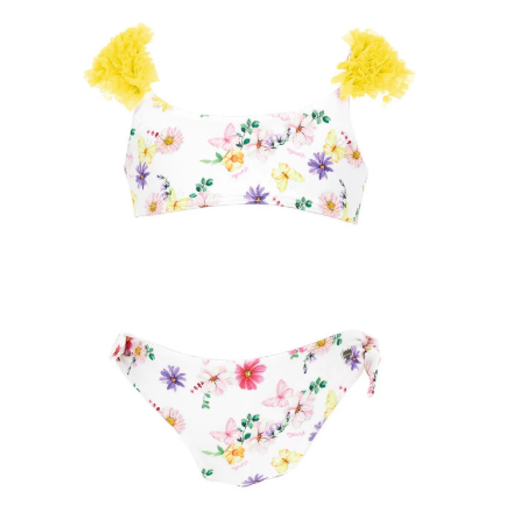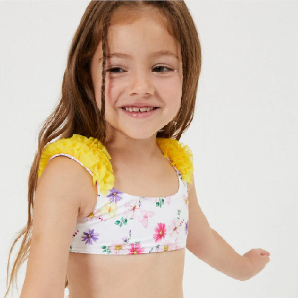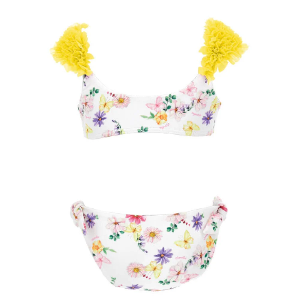 Costume MONNALISA in tessuto a fantasia con applicazione a contrasto in colore giallo alle spalline. dotato di sacchetti porta costume