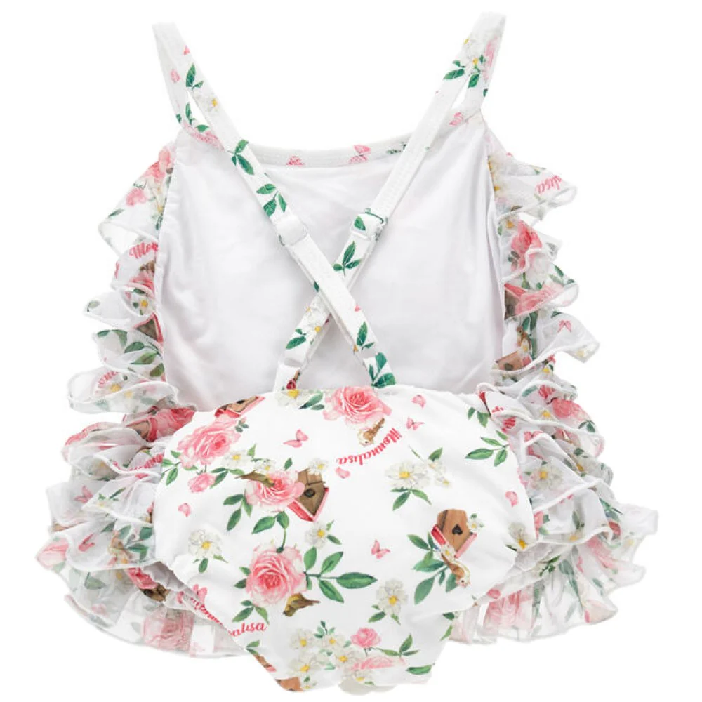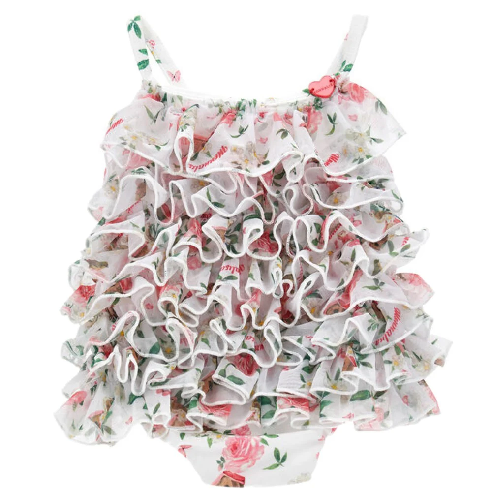 Costume MONNALISA in tessuto logato a fantasia floreale con multi balze effetto rouches in tessuto a contrasto applicate bretelle regolabili ad incrocio sul retro logo cuore applicato.