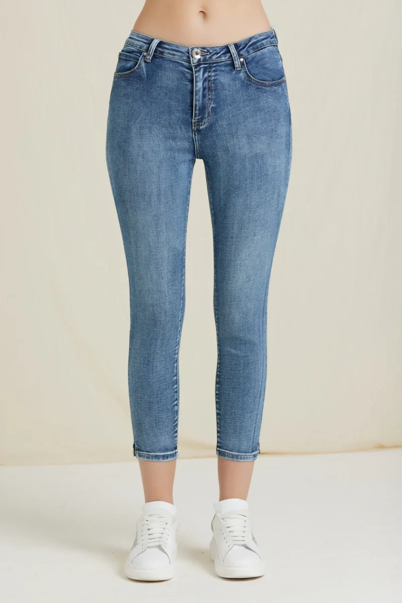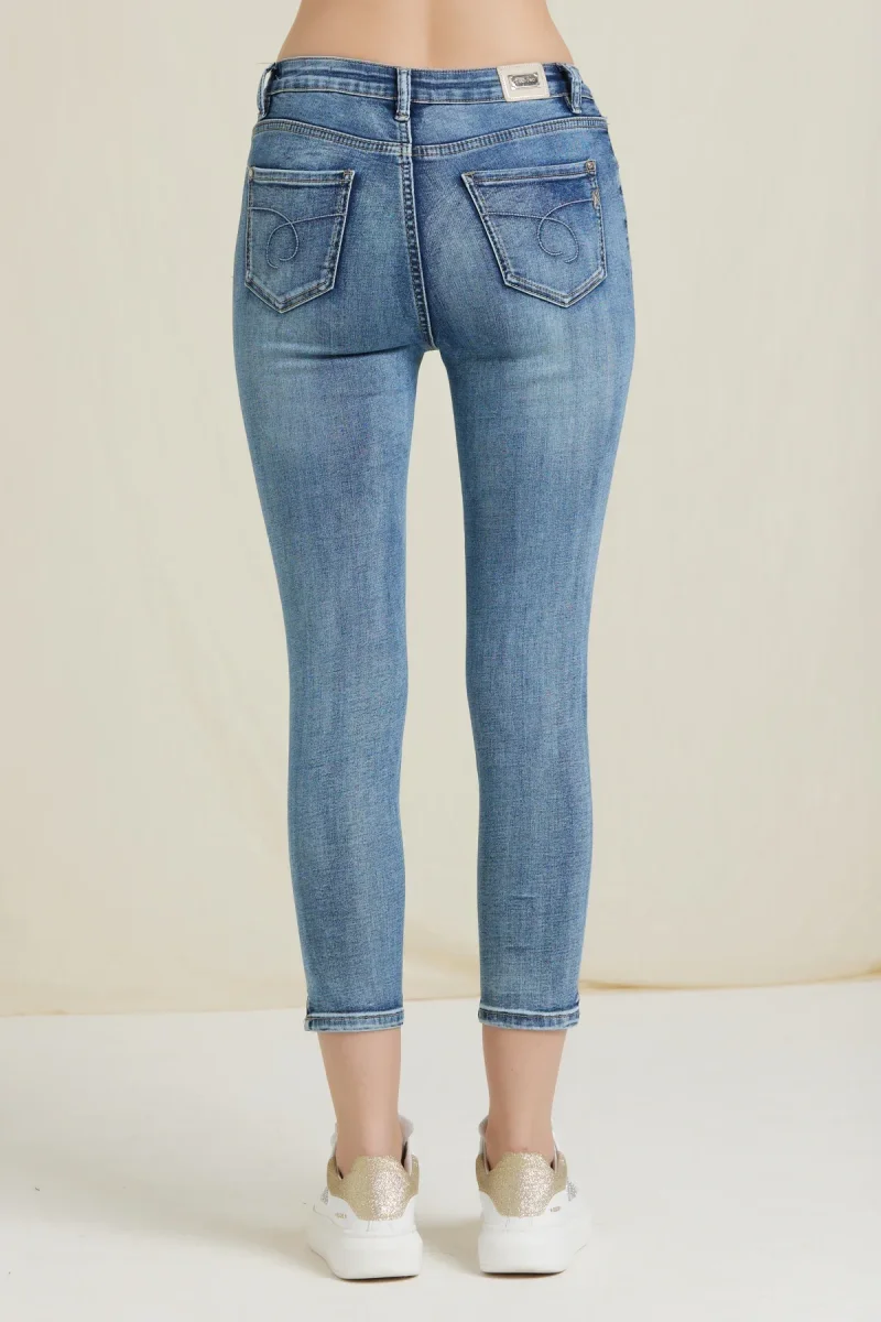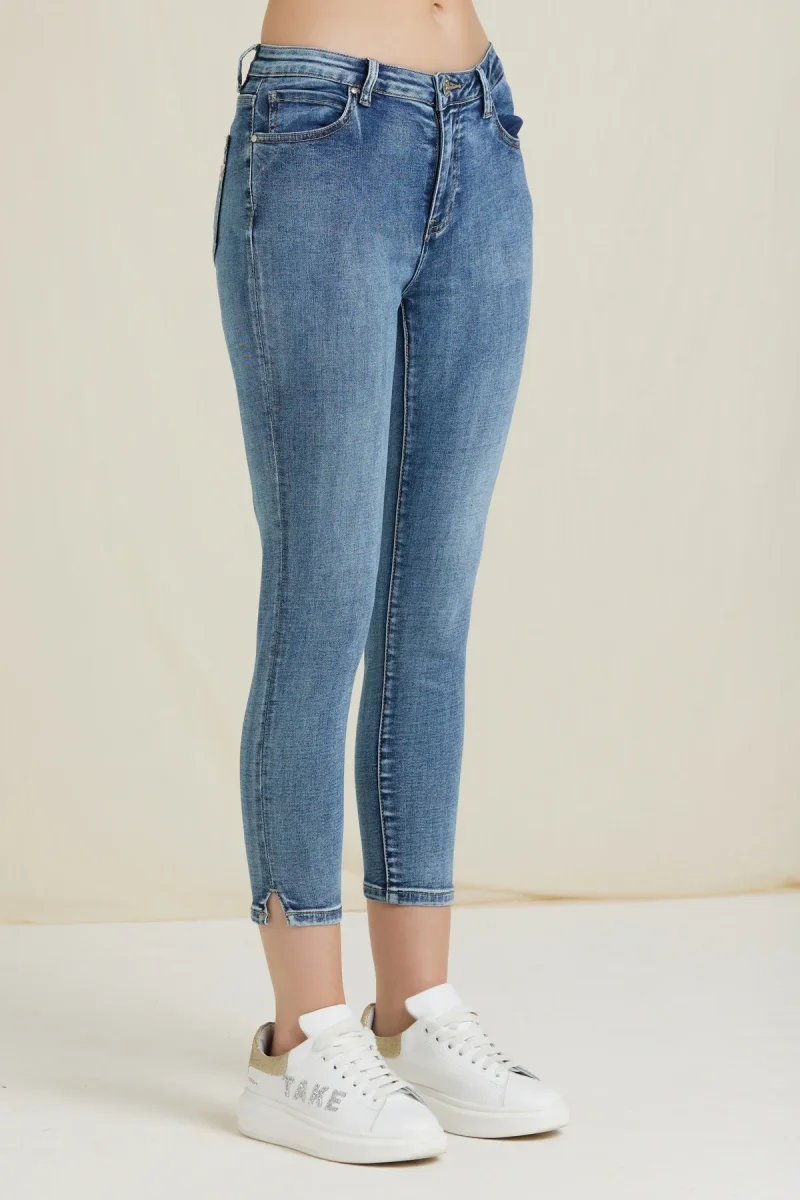 Jeans skinny fit modello capri in tessuto denim di cotone elasticizzato. Vita medio/alta, chiusura con zip e bottone, 5 tasche. Lunghezza capri alla caviglia, piega con spacchetto laterale. Vestibilità aderente molto confortevole, consigliamo l’acquisto di una taglia inferiore alla solita. Taglia in foto 27. Composizione tessuto 72% cotone 26% poliestere 2% elastan.
