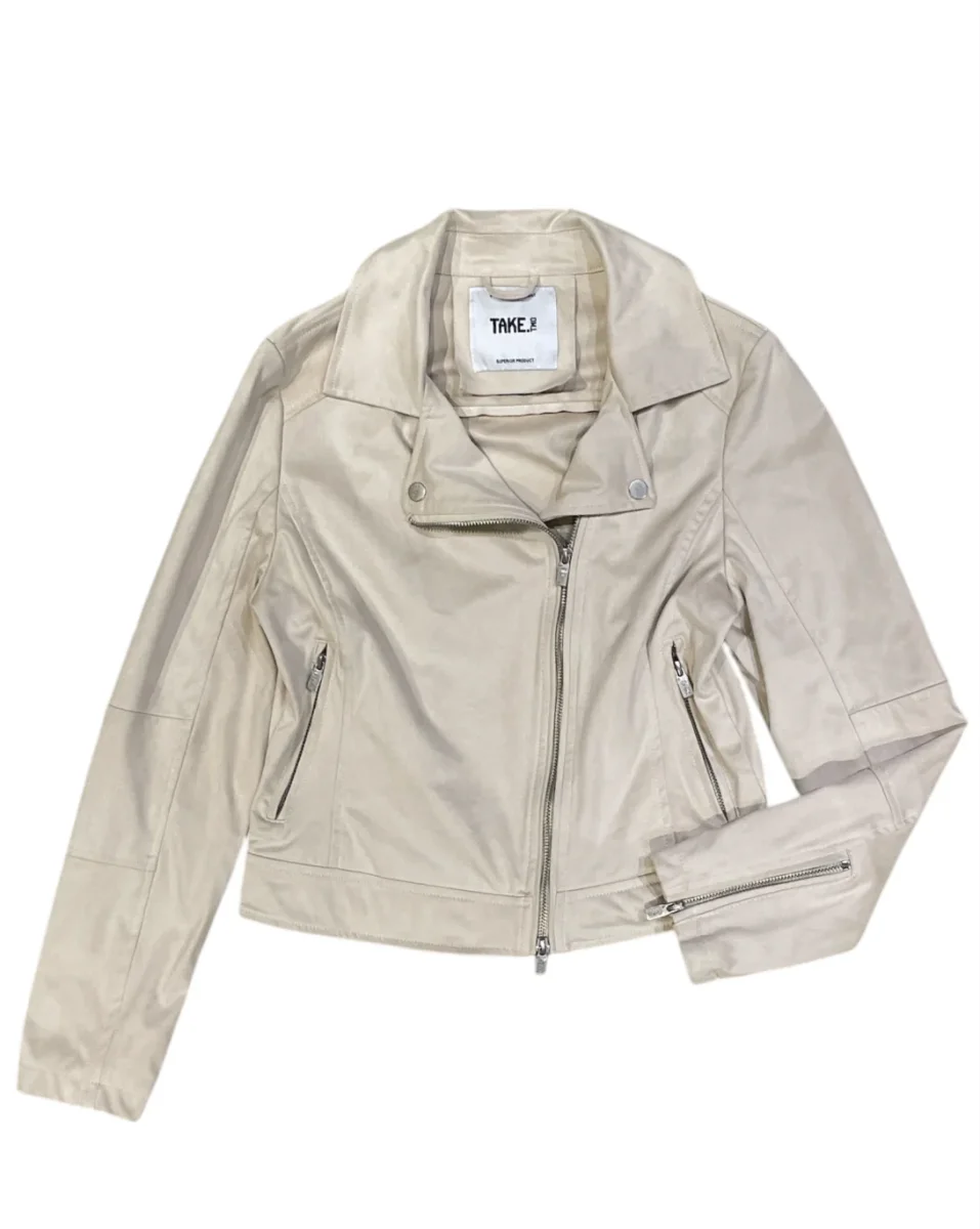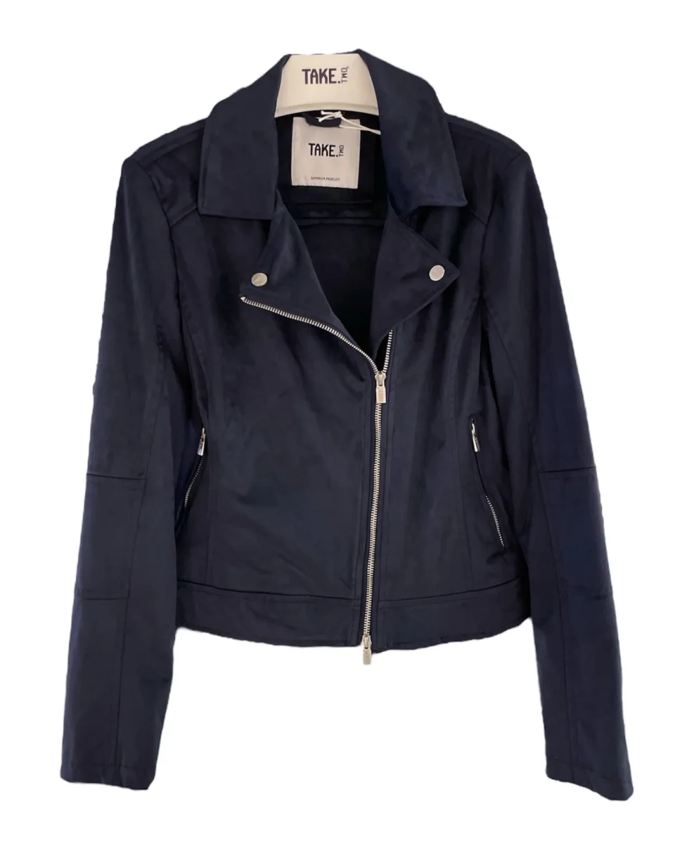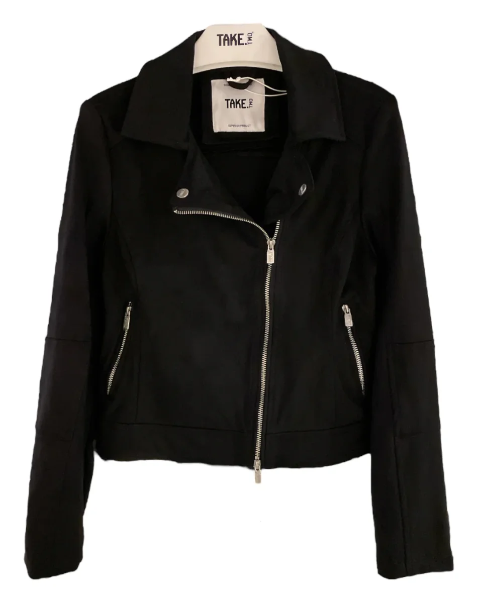 Giubbino modello chiodo in tessuto scamosciato. Collo biker con bottone automatico, chiusura con zip laterale. Tasche chiuse da zip. Maniche lunghe con polsino con doppio bottone automatico. Capo foderato. Vestibilità regolare.