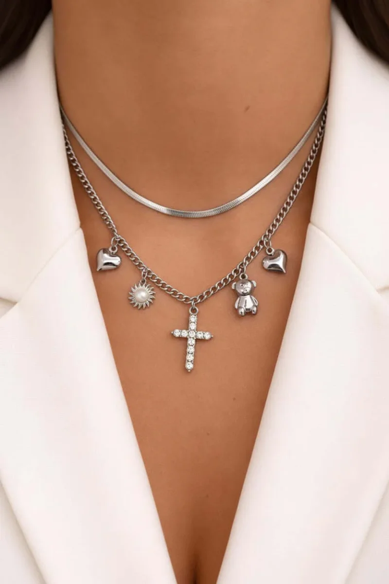 Doppia collana argento con ciondoli, nichel free, non perdono colore , in acciaio inossidabile con strass e perlina.