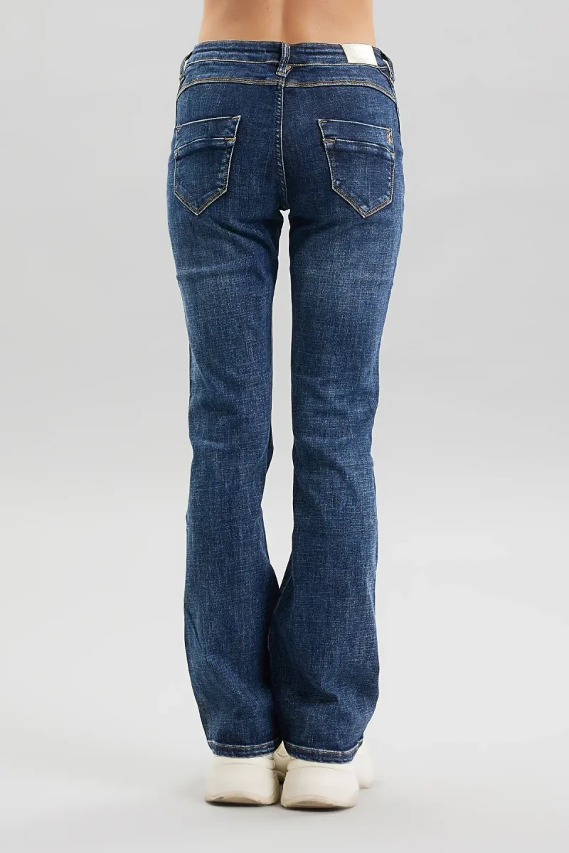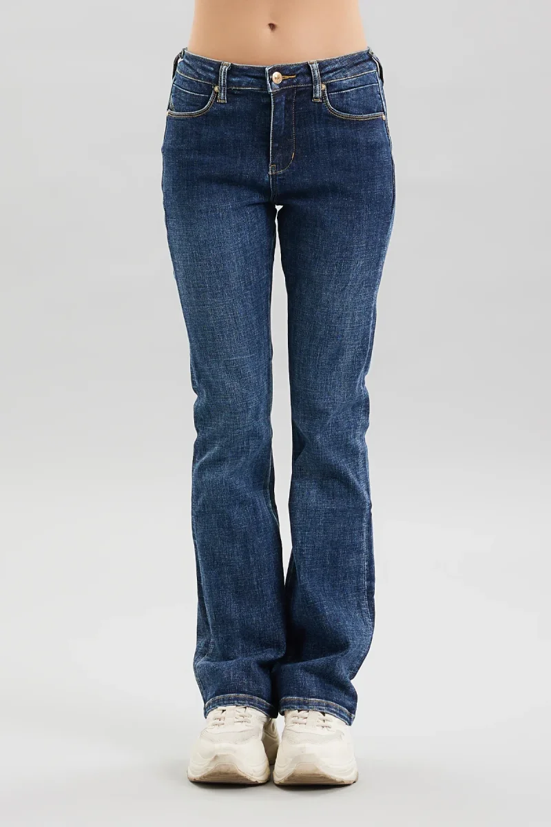 Jeans donna modello a zampa in tessuto denim di cotone elasticizzato. Vita medio-alta, 5 tasche, chiusura con zip e bottone. Dettagli diagonali cuciti su entrambi i lati. Gamba stretta fino al ginocchio e fondo ampio. Vestibilità regolare, taglia in foto 27. Composizione tessuto 98% cotone 2% elastan.