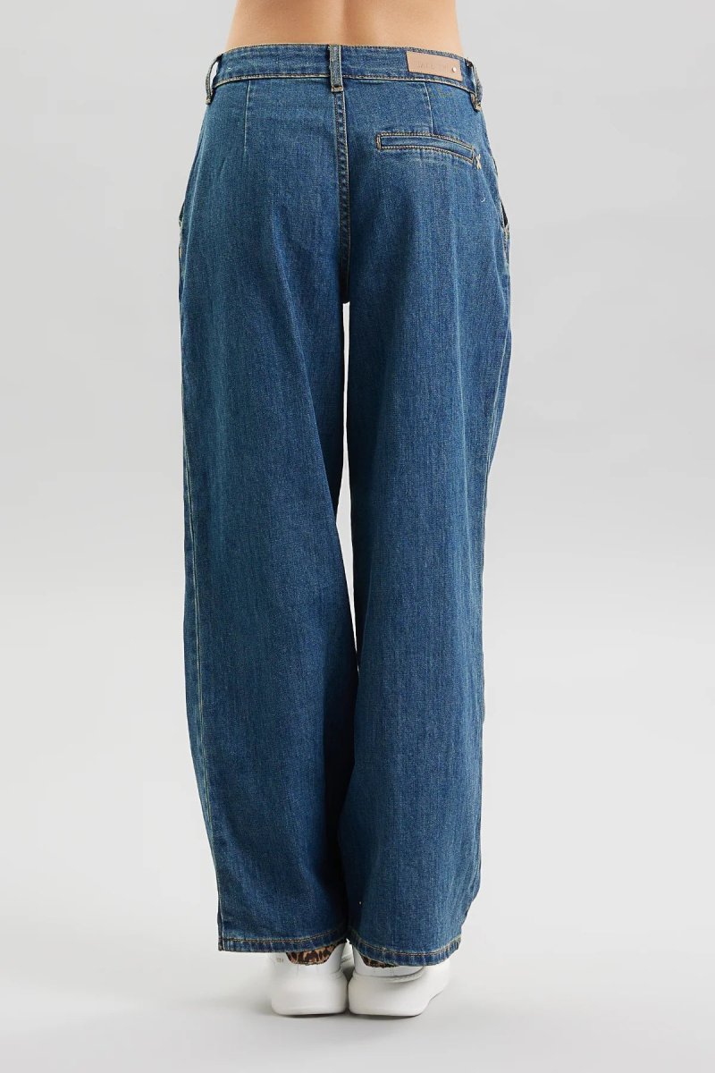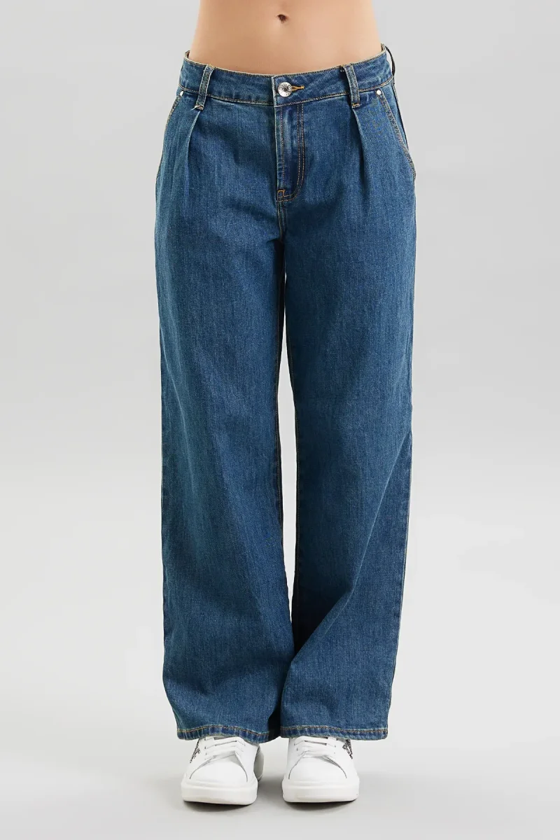 Jeans donna in tessuto denim di cotone lavaggio scuro effetto sporcato. Vita regolare con pences, tasche a filo laterali e taschino posteriore. Modello palazzo, gamba e fondo ampi. Vestibilità regolare, taglia in foto 27. Composizione tessuto 98% cotone 2% elastan.