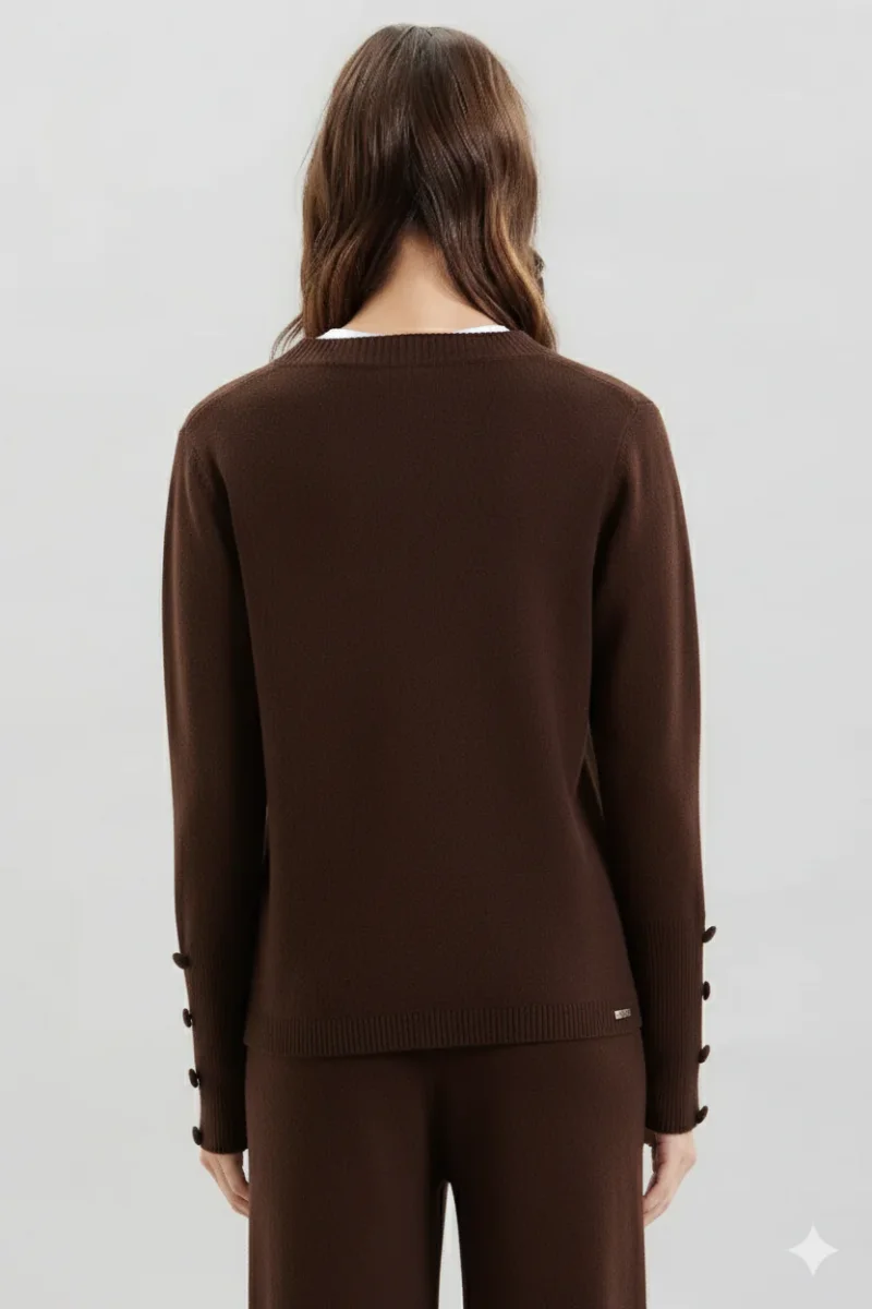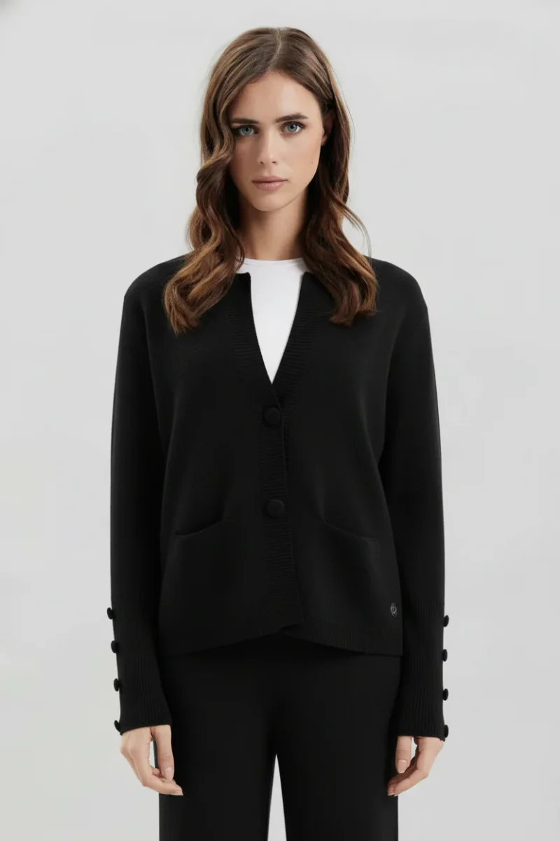 Cardigan donna in tessuto maglia chiusa misto viscosa. Scollo ampio, bordi rifinito a coste, bottoni rivestiti. Taschine laterali. Maniche lunghe con bottoni rivestiti applicati su polsini elasticizzati lunghi. Vestibilità regolare. Crea il completo con il pantalone abbinato. Taglia in foto S. Composizione tessuto 51% viscosa, 28% poliestere, 21% nylon.