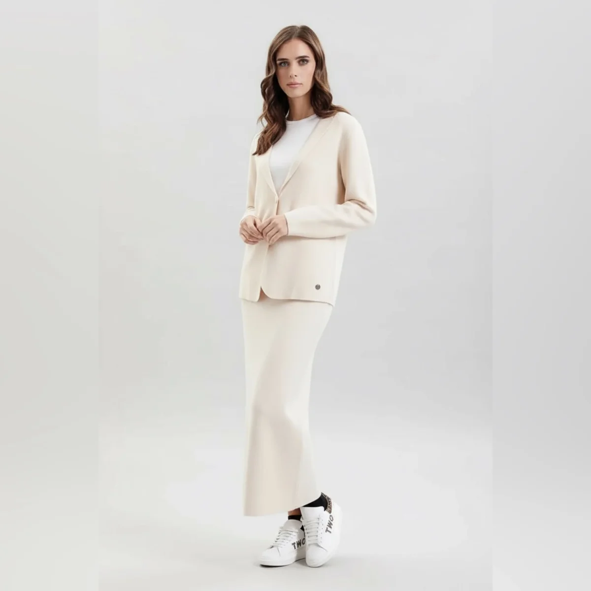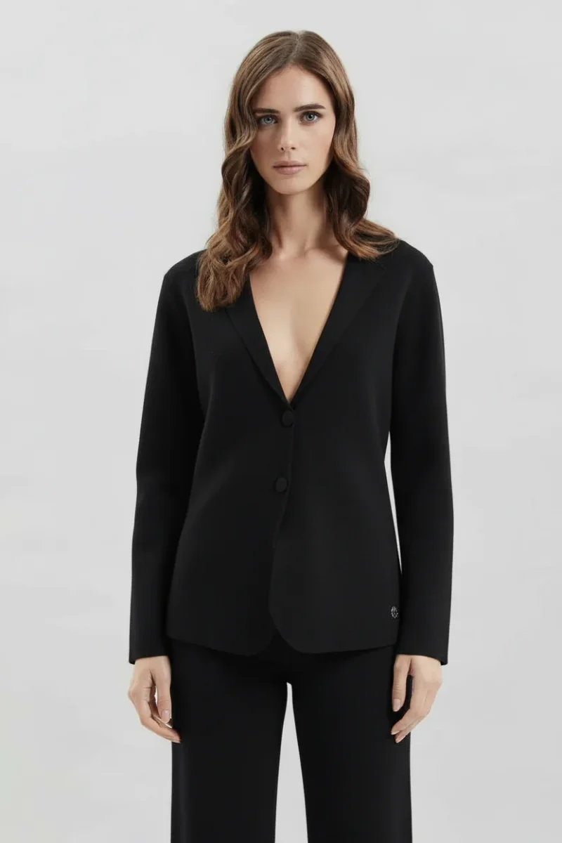 Giacca donna in maglia chiusa misto viscosa. Collo sciallato, chiusura a due bottoni rivestiti. Maniche lunghe. Logo brand cucito sul fondo, fondo stondato. Vestibilità dritta. Crea il completo con la gonna abbinata. Taglia in foto S. Composizione tessuto 51% viscosa 28% poliestere 21% nylon.