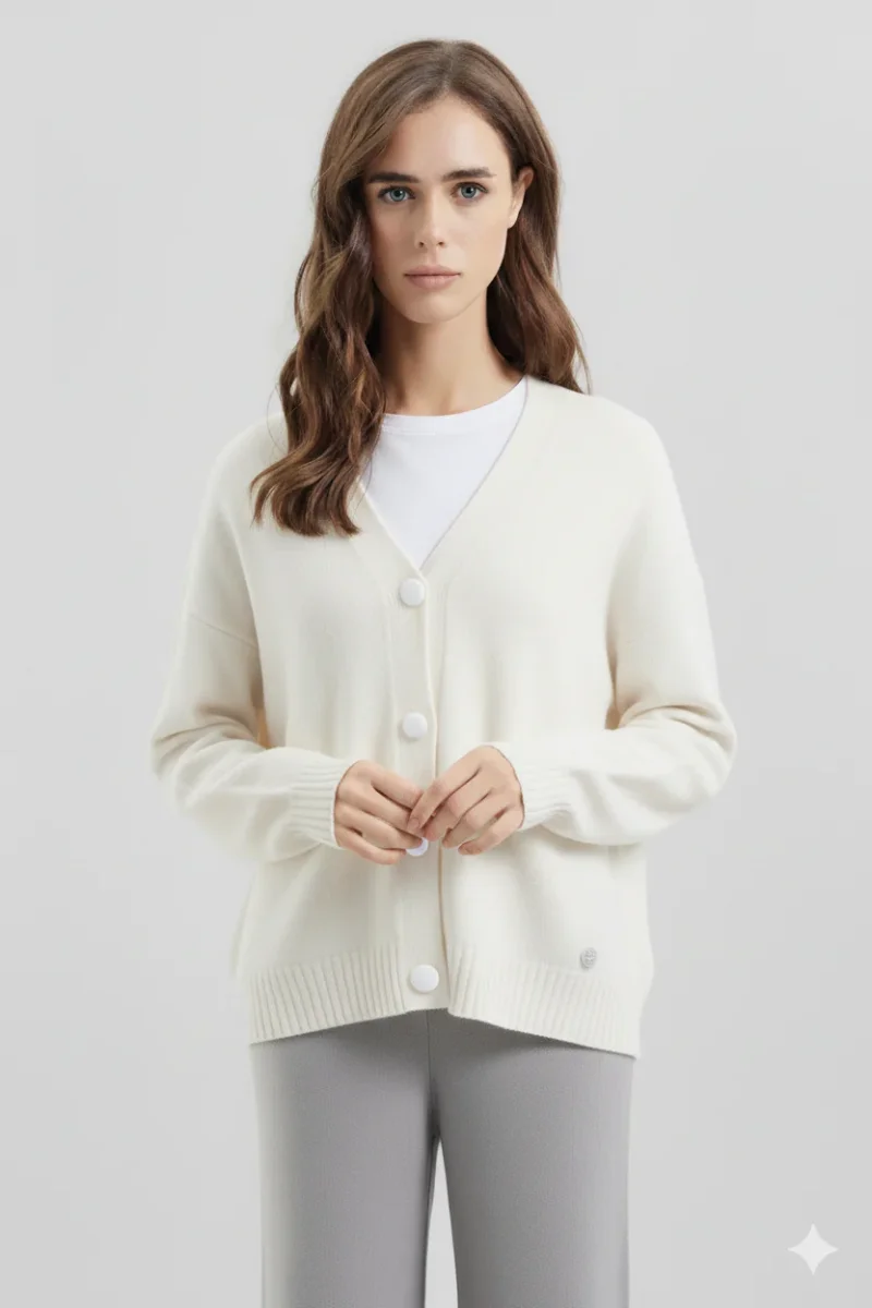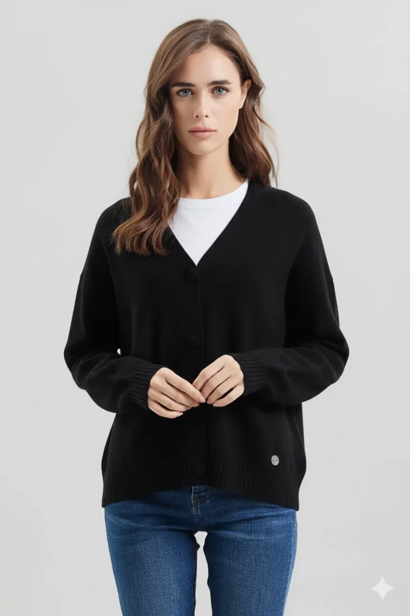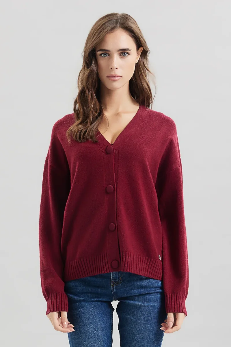 Cardigan donna over in tessuto morbido misto viscosa. Scollo a punta, chiusura con bottoni rivestiti. Spalla raglan, maniche lunghe larghe, fondo leggermente ampio. Bordi rifiniti a coste. Logo brand cucito sul fondo. Composizione tessuto 51% viscosa, 28% poliestere, 21% nylon.