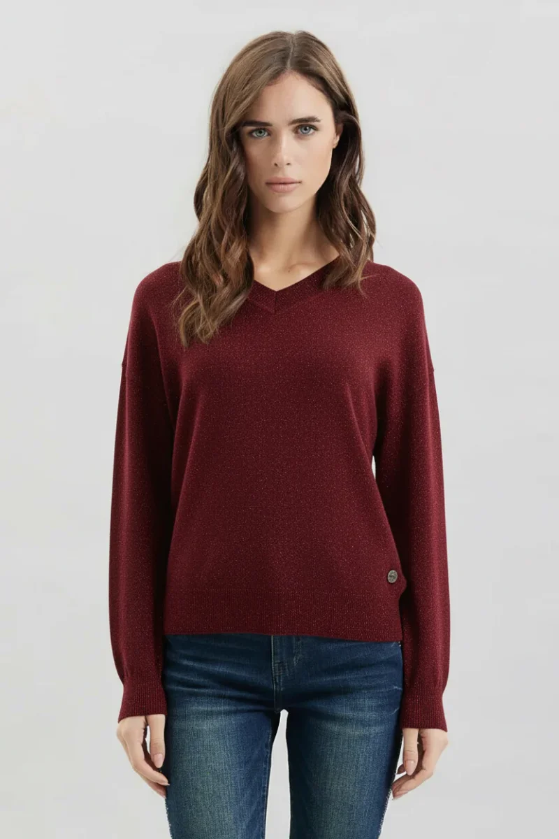 Maglia donna in tessuto misto viscosa con inserti lurex argento. Scollo a V con bordo rifinito a costine, spalla raglan, maniche lunghe ampie, vestibilità slim. Bordi rifiniti a costine, logo brand cucito sul fondo. Composizione tessuto 51% viscosa, 28% poliestere, 21% nylon.