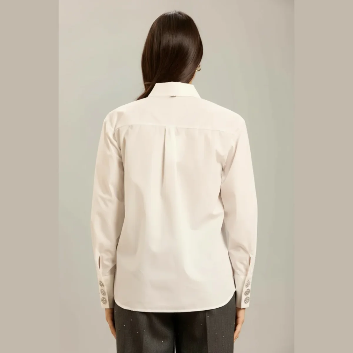 Camicia donna oversize in tessuto popeline di cotone. Colletto piccolo, corpo dritto con piegone centrale e sulla schiena. Bottoni gioiello sul collo e sui polsini. Vestibilità comoda. Composizione tessuto 65% poliestere 35% cotone.