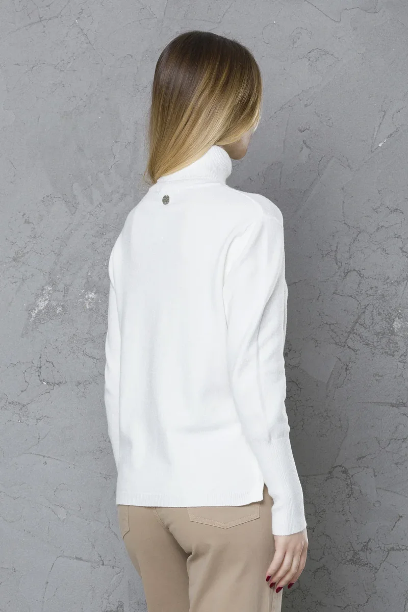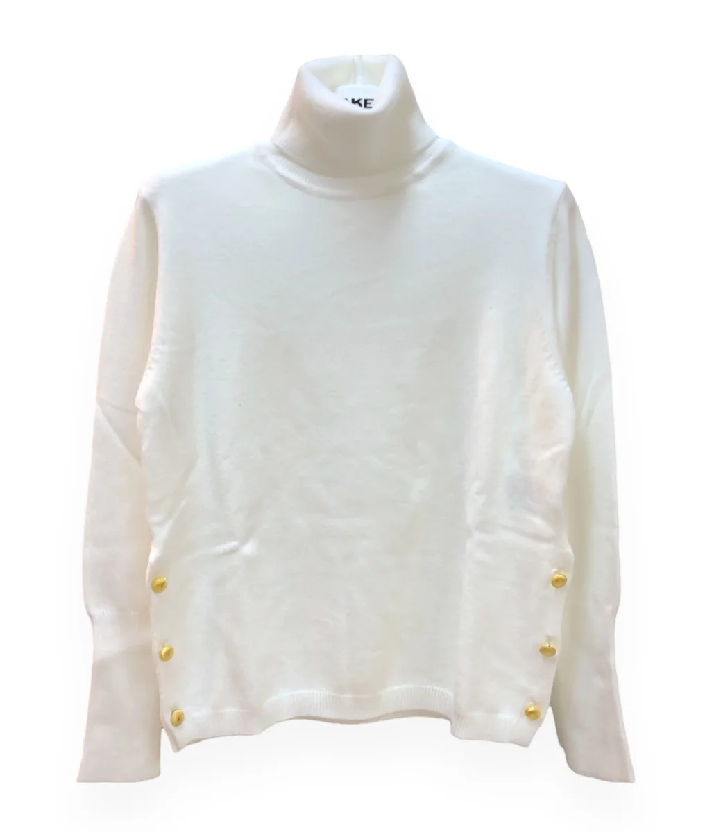 Maglia collo alto dolcevita in tessuto elasticizzato misto viscosa. Bordi, polsini e collo rifiniti a canaletti. Vestibilit� dritta, spacchetti laterali con bottoni dorati applicati. Composizione tessuto 50% viscosa 28% poliestere 22% nylon. Crea il completo con il pantalone in maglina.