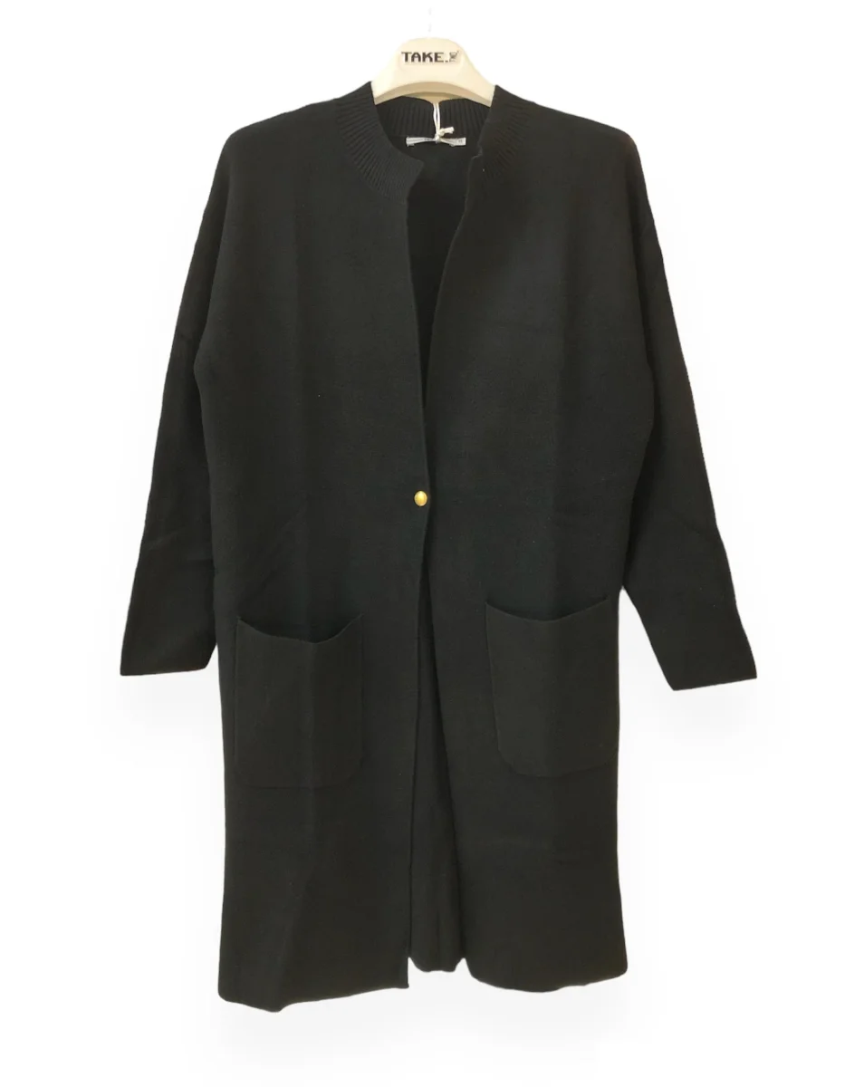 Cappottino in tessuto maglina elasticizzata misto viscosa. Collo a pistagna, chiusura al centro con bottone dorato. Tasche quadrate applicate, maniche lunghe. Vestibilit� dritta. Taglia in foto S. Composizione tessuto 50% viscosa 28% poliestere 22% nylon.