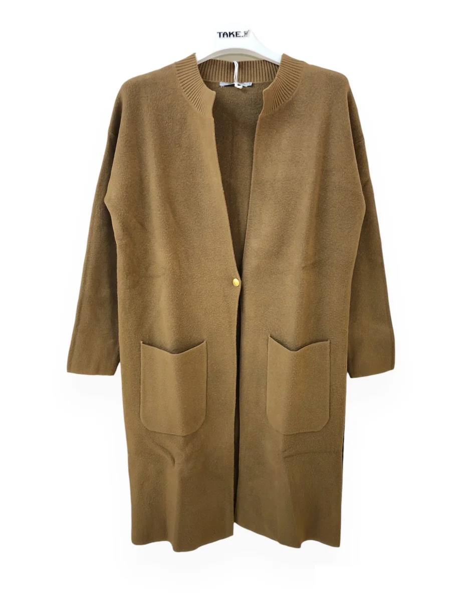 Cappottino in tessuto maglina elasticizzata misto viscosa. Collo a pistagna, chiusura al centro con bottone dorato. Tasche quadrate applicate, maniche lunghe. Vestibilit� dritta. Taglia in foto S. Composizione tessuto 50% viscosa 28% poliestere 22% nylon.