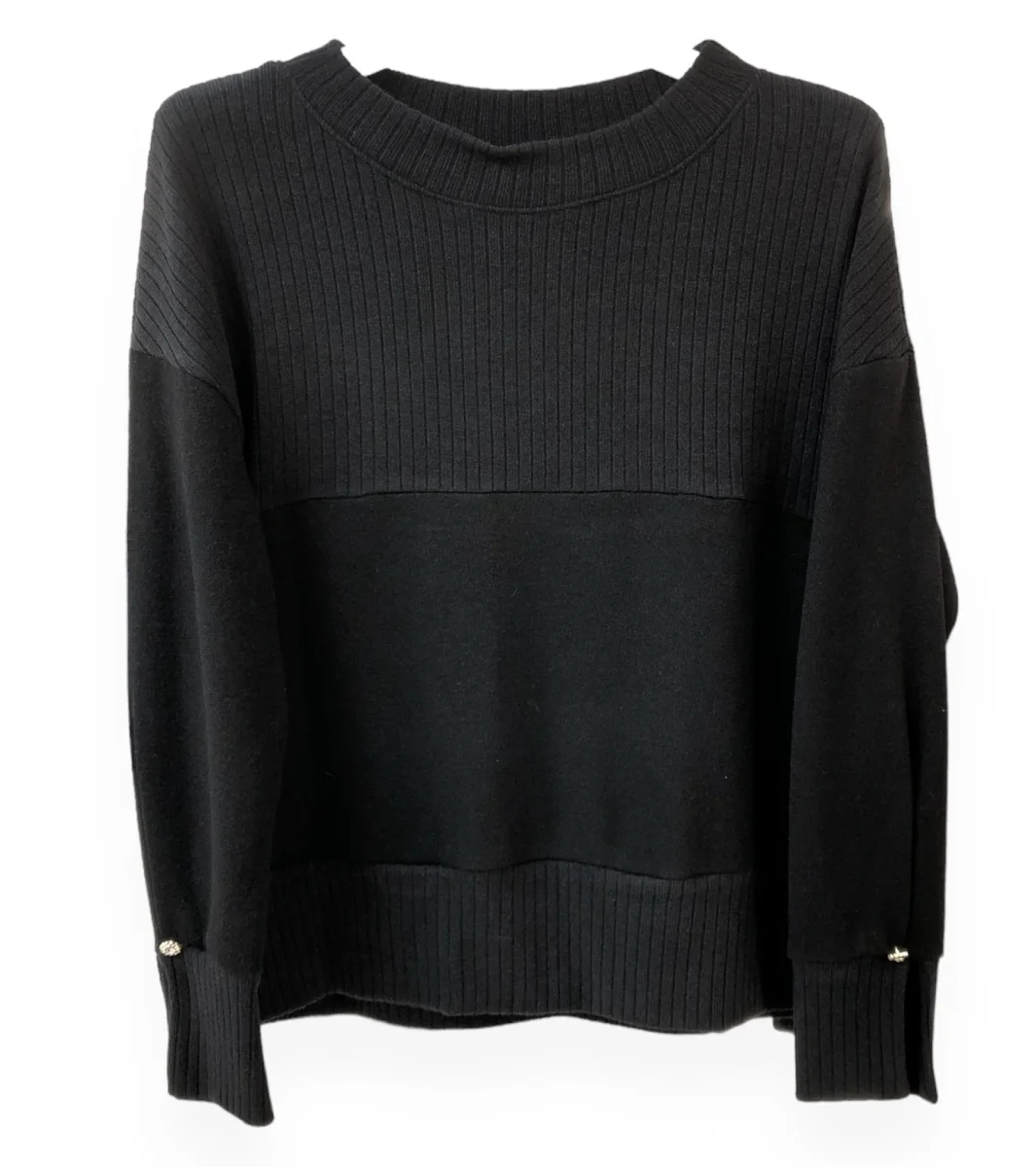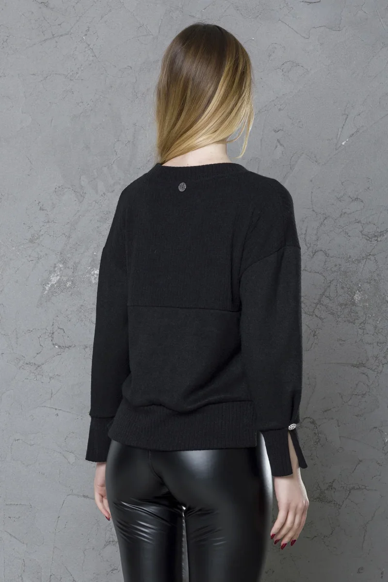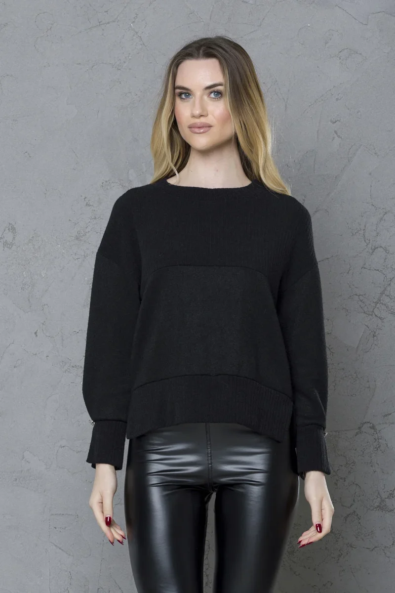 Maglia ampia modello felpa in tessuto misto viscosa mano cachemire. Girocollo ampio. Tessuto lavorato sul petto e sul fondo,tessuto liscio nella parte centrale. Maniche lunghe con spacchetto e bottone gioiello. Vestibilit� comoda. Taglia in foto S. Composizione tessuto 45% viscosa 36% poliestere 19% nylon.