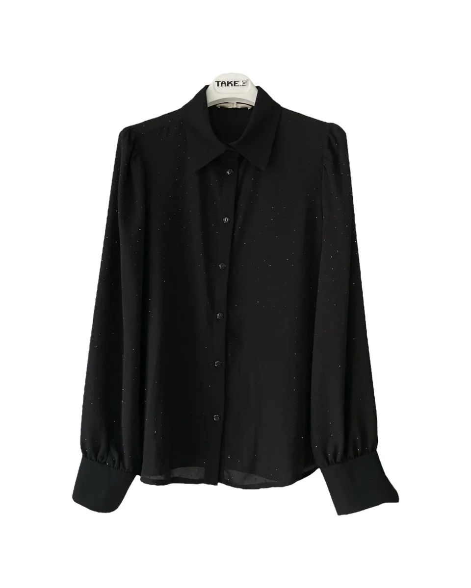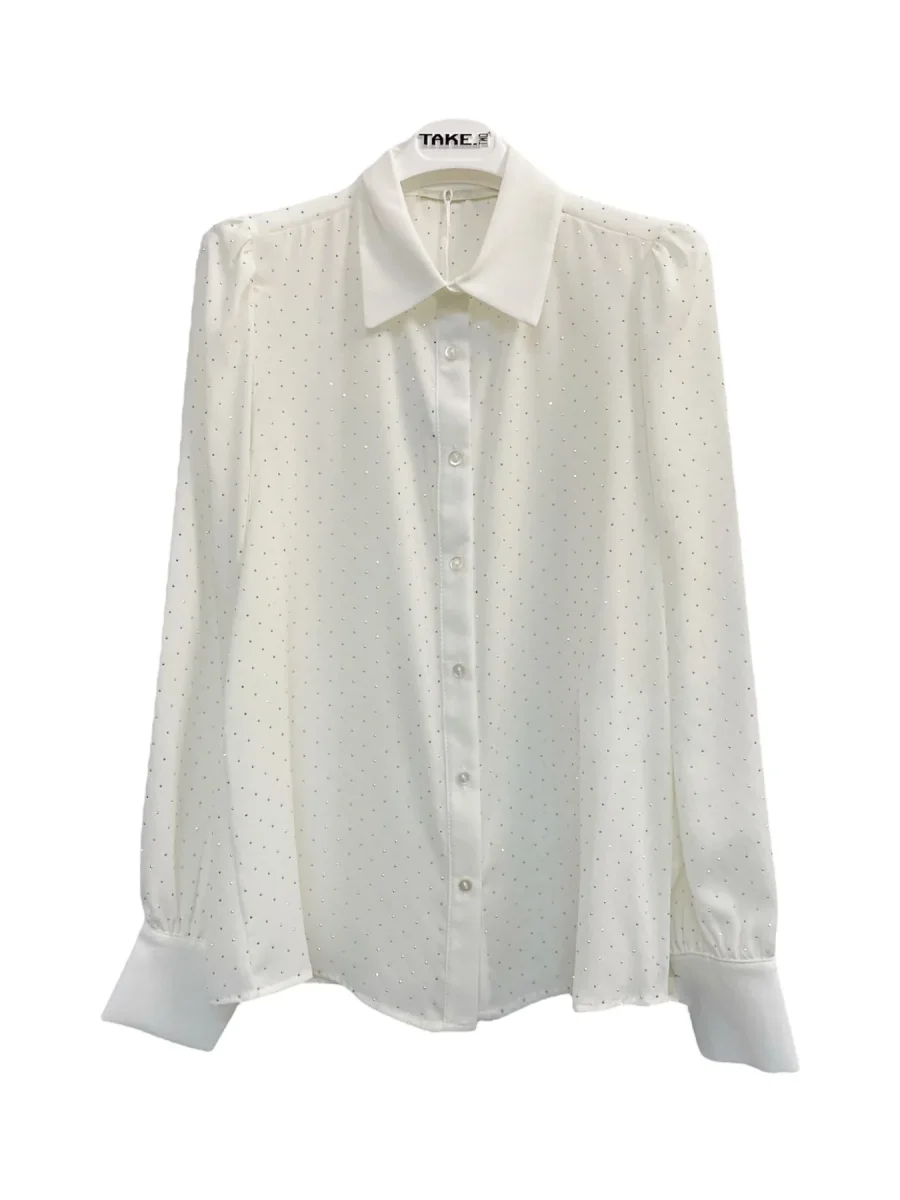Camicia in chiffon con strass applicati su tutta la superficie. Colletto piccolo, chiusura con bottoni in tinta. Maniche lunghe con bottoni in tinta. Vestibilità regolare. Tessuto 100% poliestere
