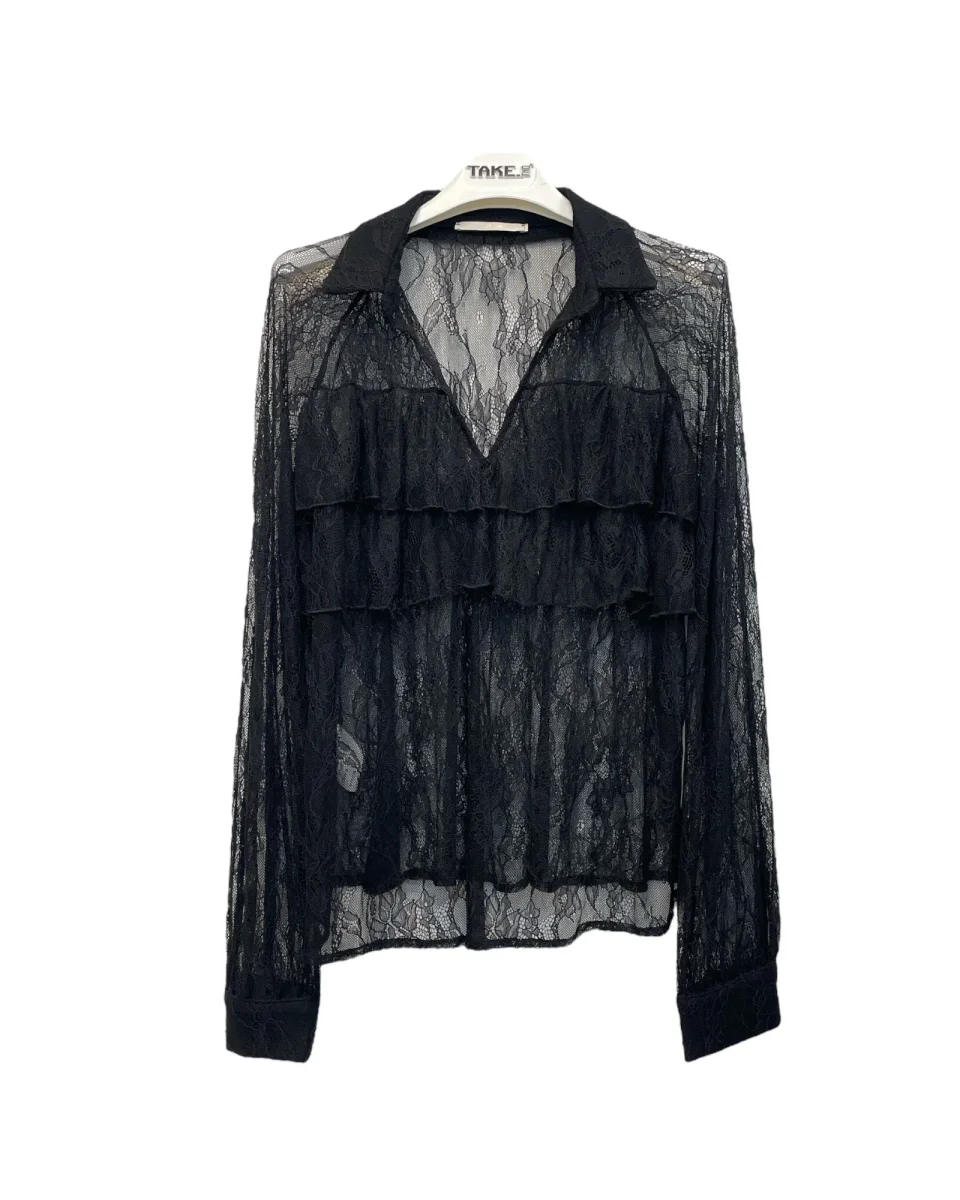 Camicia in tessuto pizzo. Colletto piccolo, scollo a punta aperto. Rouches sul petto. Maniche lunghe, vestibilità dritta. Tessuto pizzo 100% poliestere.