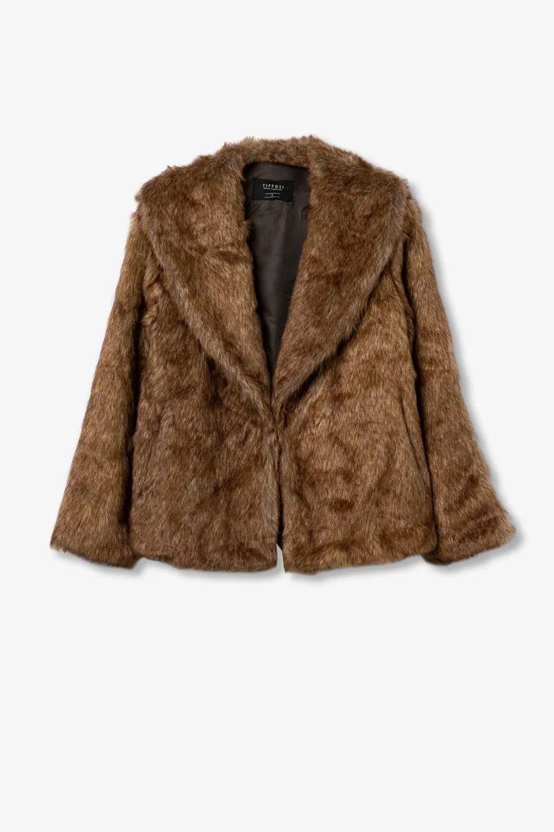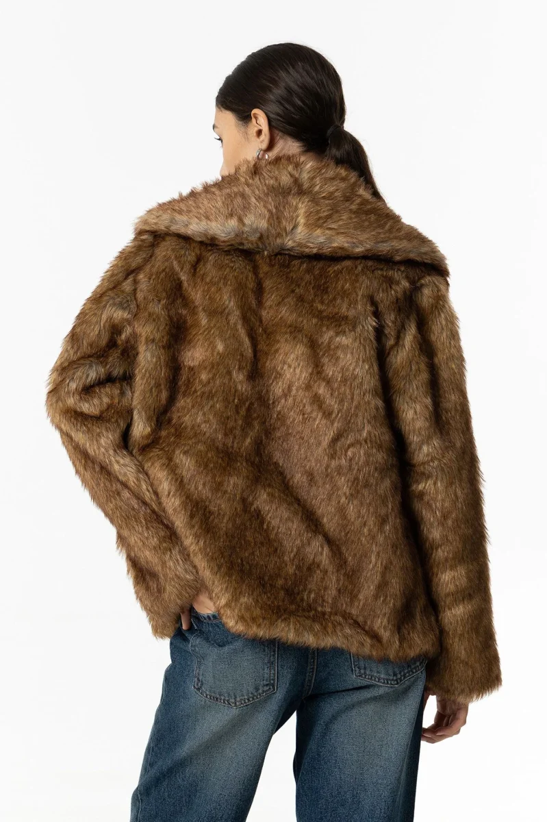 Ecopelliccia corta effetto visone. Collo camicia sciallato, chiusura con gancio interno. Vestibilità dritta.