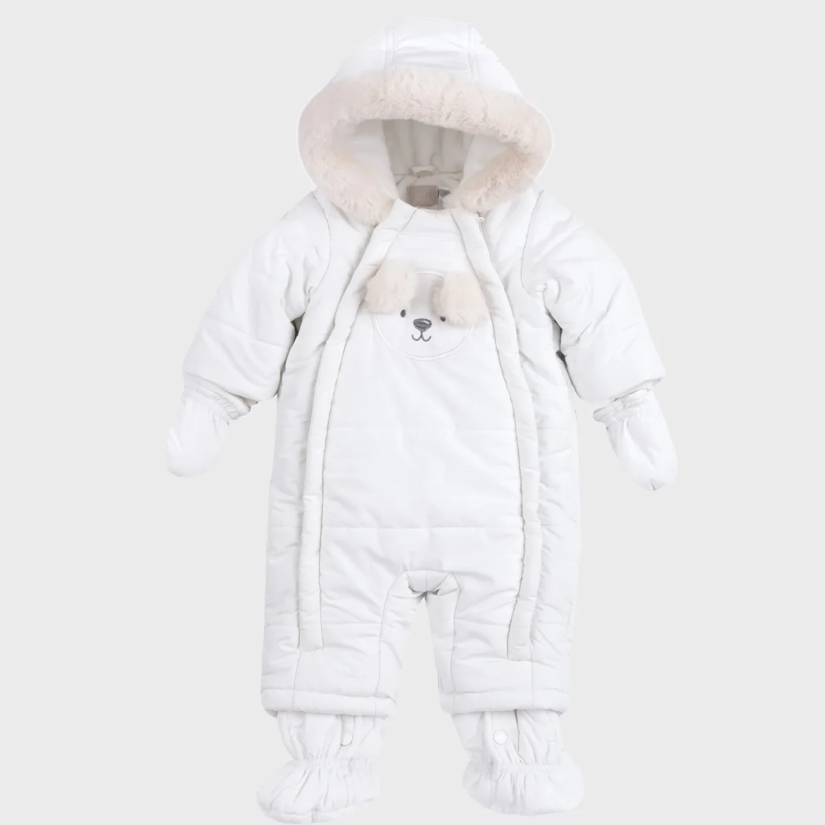 Eskimo CHICCO foderato in ecopelliccia, chiusura con clips e doppia zip, cappuccio con bordo in ecopelliccia, ricami ed inserti in ecopelliccia applicati, guantini e piedini foderati in ecopelliccia removibili mediante clips.