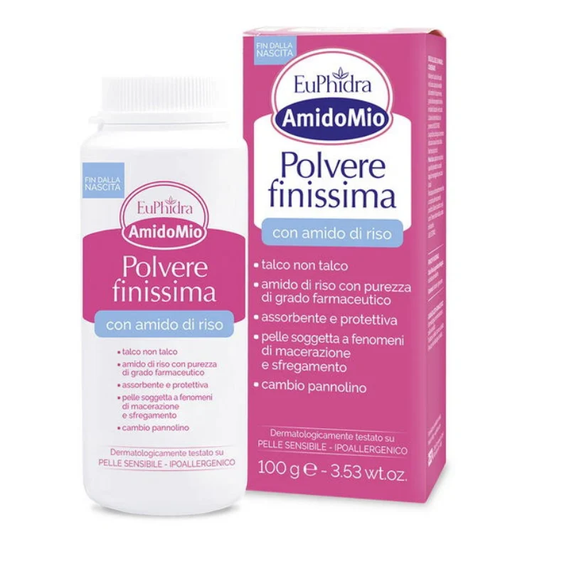 La polvere finissima Euphidra AmidoMio è formulata con amido di riso puro al 100%, ingrediente naturale dalle particelle ultra-finissime. Grazie alla sua texture eccezionalmente fine, non ostruisce i pori della pelle permettendo la naturale traspirazione dell’epidermide. Ideale per assorbire l’umidità in eccesso e mantenere la pelle asciutta, fresca e protetta. Perfetta per neonati, bambini e adulti con pelle sensibile e delicata. Euphidra, brand farmaceutico italiano di eccellenza, garantisce qualità, purezza e sicurezza certificate.