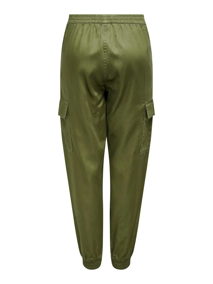 Pantalone sportivo modello cargo in tessuto lucido rasato misto cotone. Vita alta con elastico, tasche a filo e tasconi applicati su entrambe le gambe. Gamba comoda e fondo stretto con elastico. Vestibilità regolare. Compozione tessuto 53% lyocell tencell, 47% cotone.