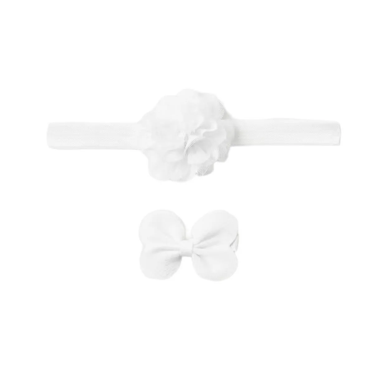 Fascia MAYORAL con fiore in tulle laminato ed elastico applicato; fermaglio MAYORAL con fiocco in tessuto e tulle laminato, mollettina rivestita in tessuto applicata sul retro.
