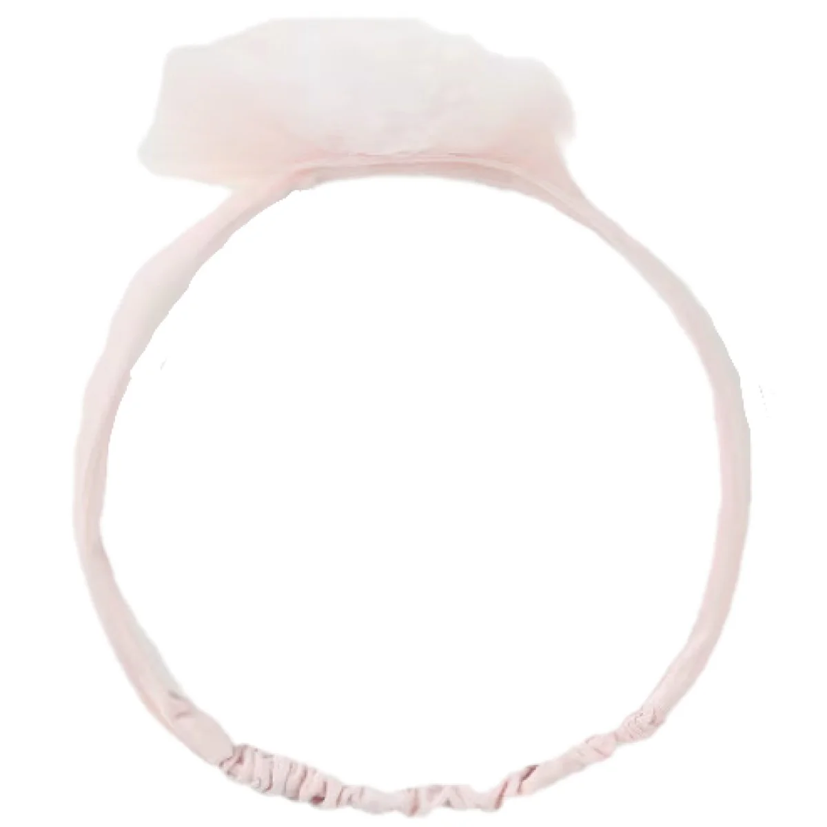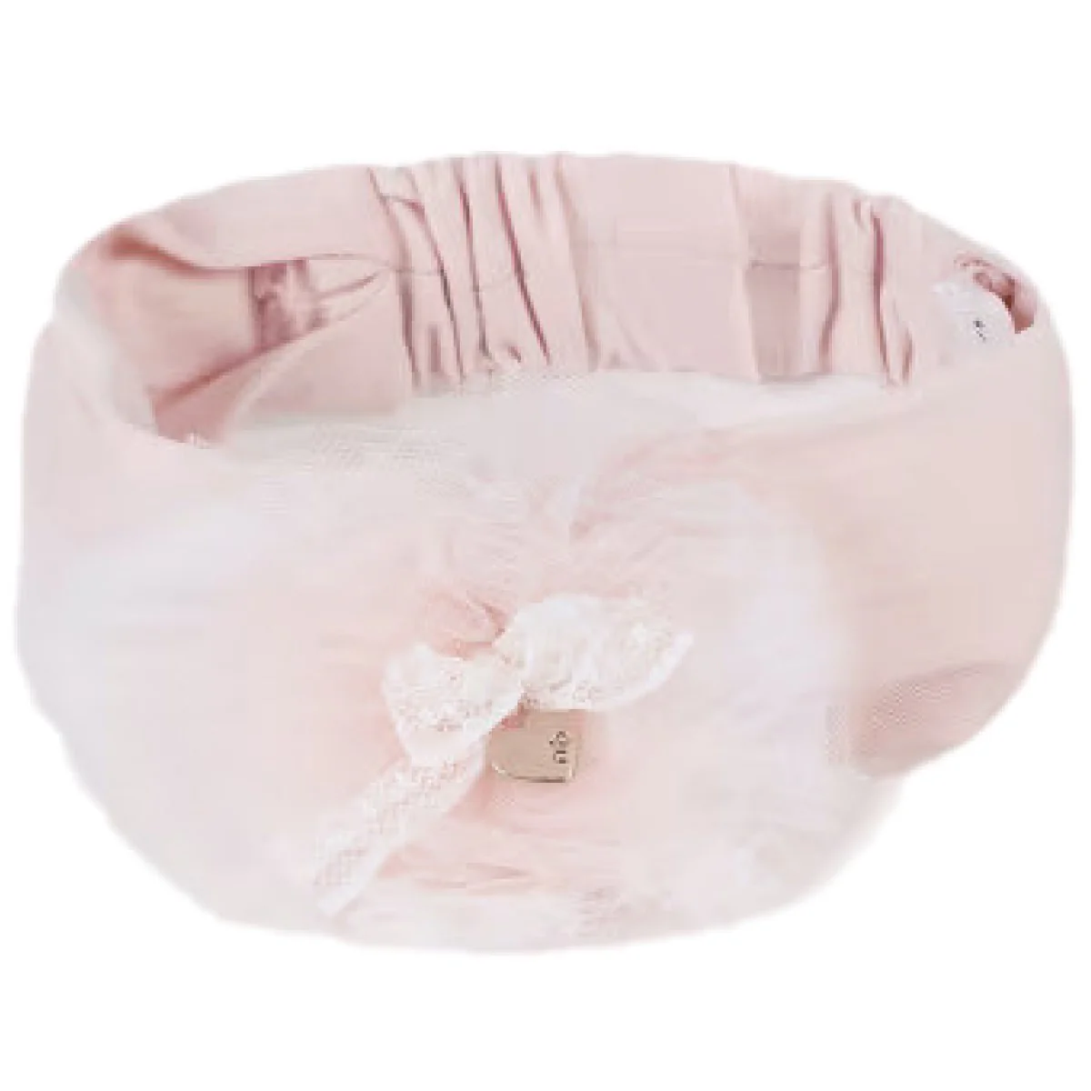 Fascia MAYORAL in cotone con tulle applicato, elastico sul retro, fiocco in merletto e cuore in metallo logato applicati.