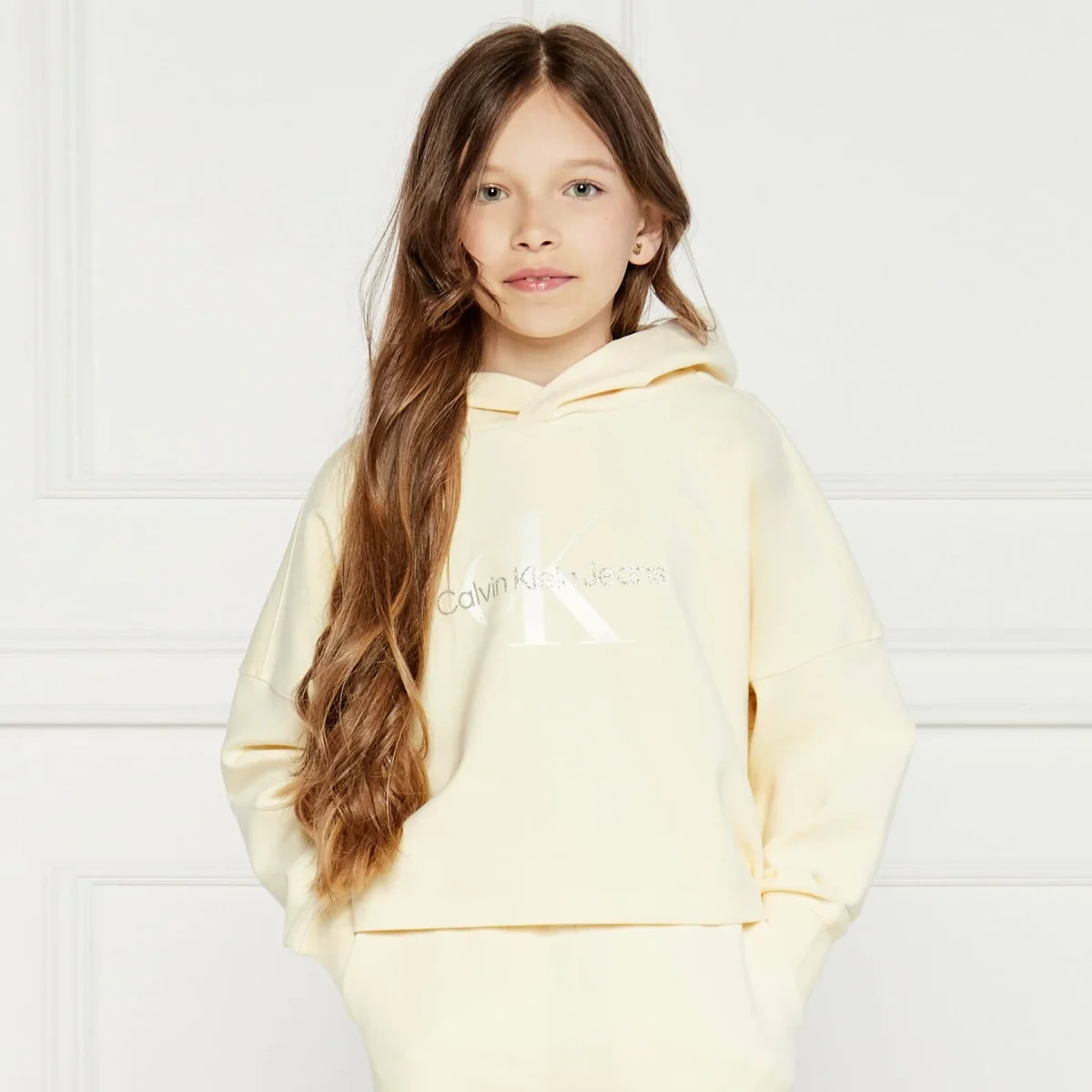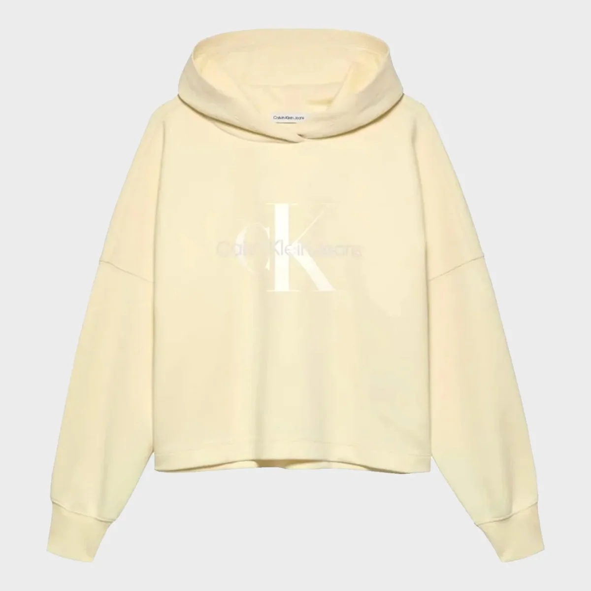 Felpa CALVIN KLEIN modello corto con cappuccio , logo glitter stampato sulla parte frontale ,polsino elastico.