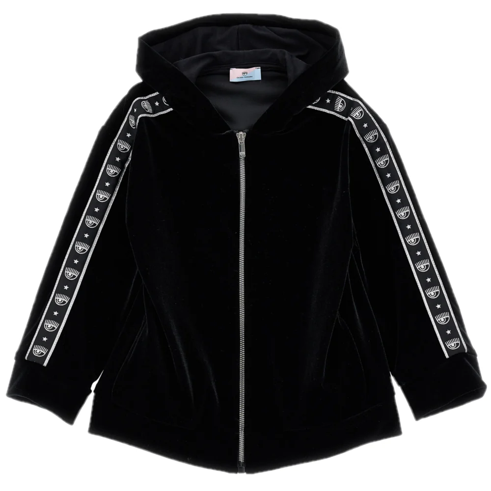 Felpa CHIARA FERRAGNI in ciniglia modello con cappuccio bande logate su maniche tasche laterali e chiusura zip con cursore logato.