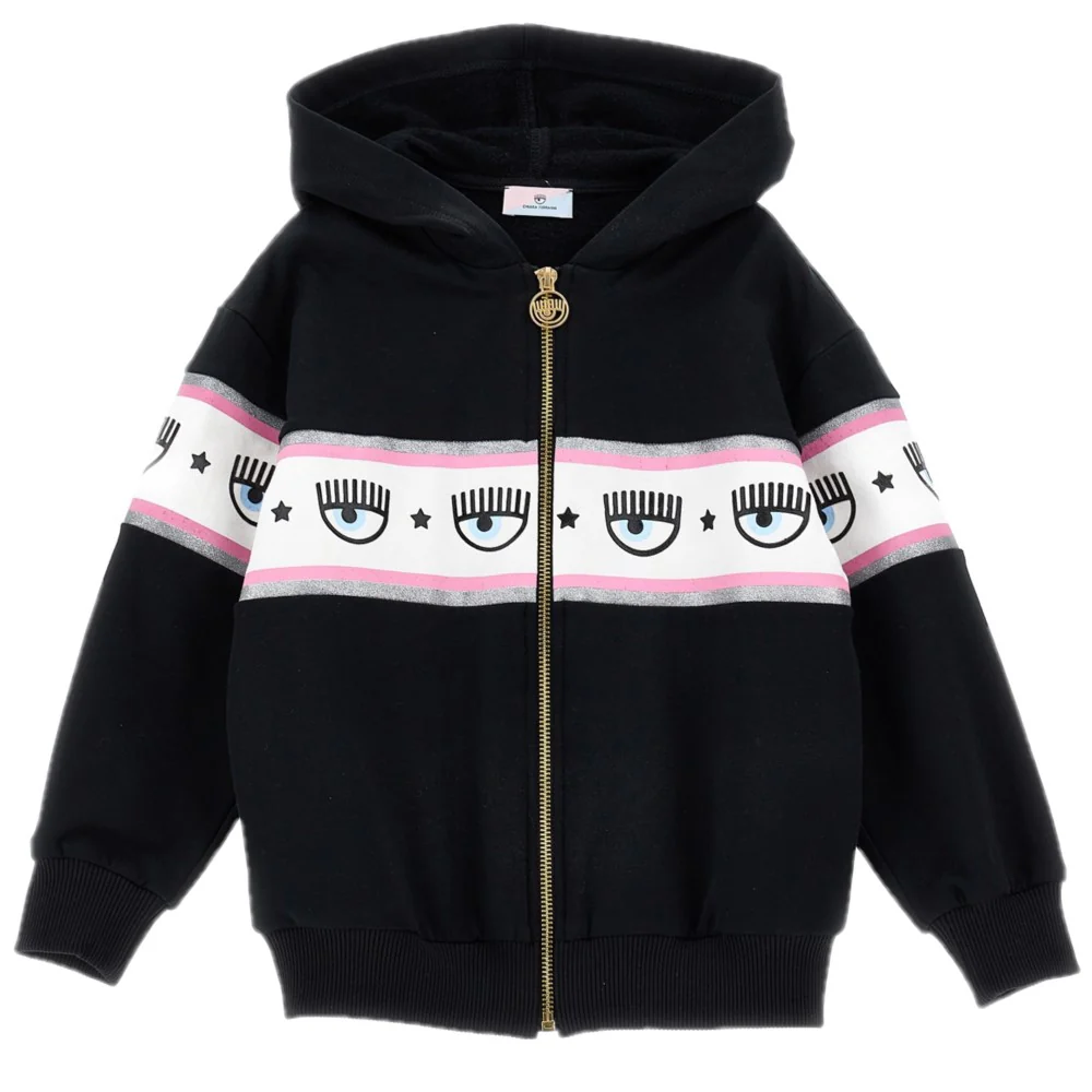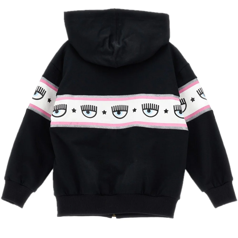 Felpa CHIARA FERRAGNI modello con cappuccio loghi a contrasto e riga glitterata interno felpato chiusura con zip intera con cursore logato.