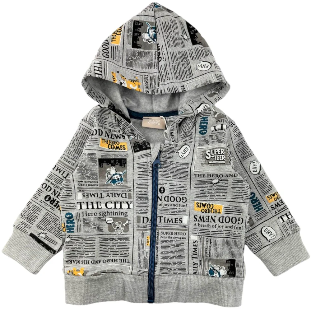Felpa CHICCO con interno felpato a fantasia modello con cappuccio chiusura zip intera taschini laterali.